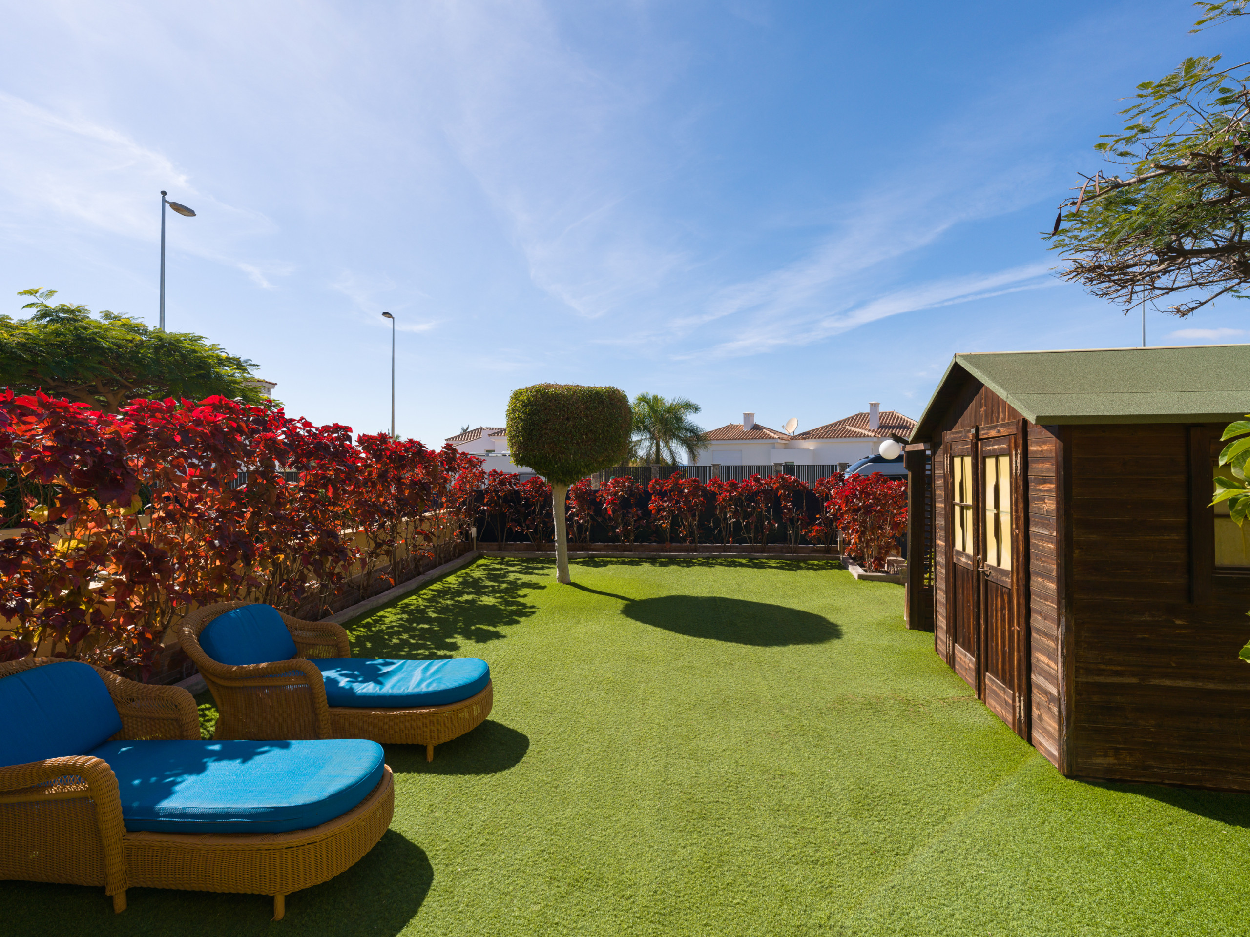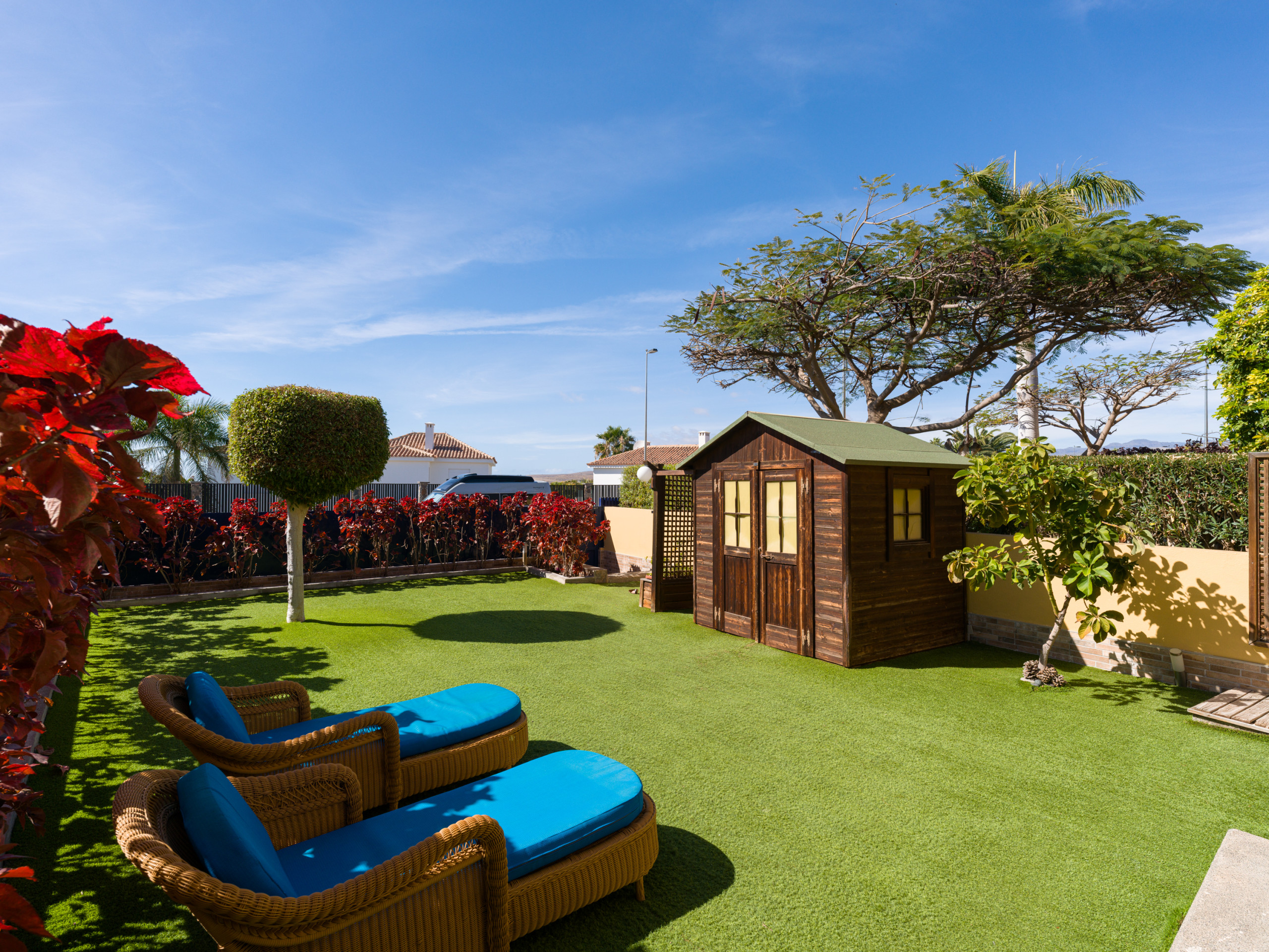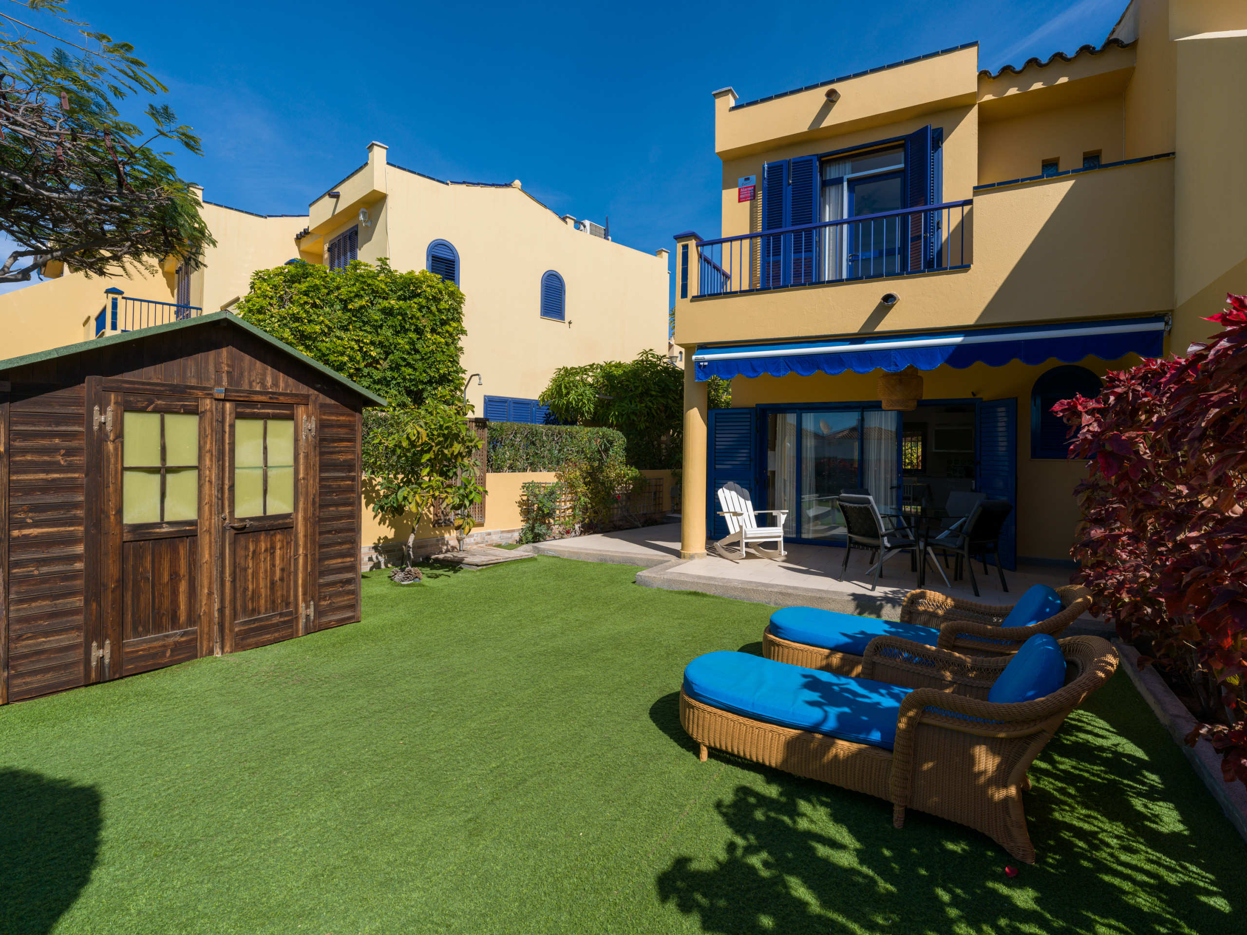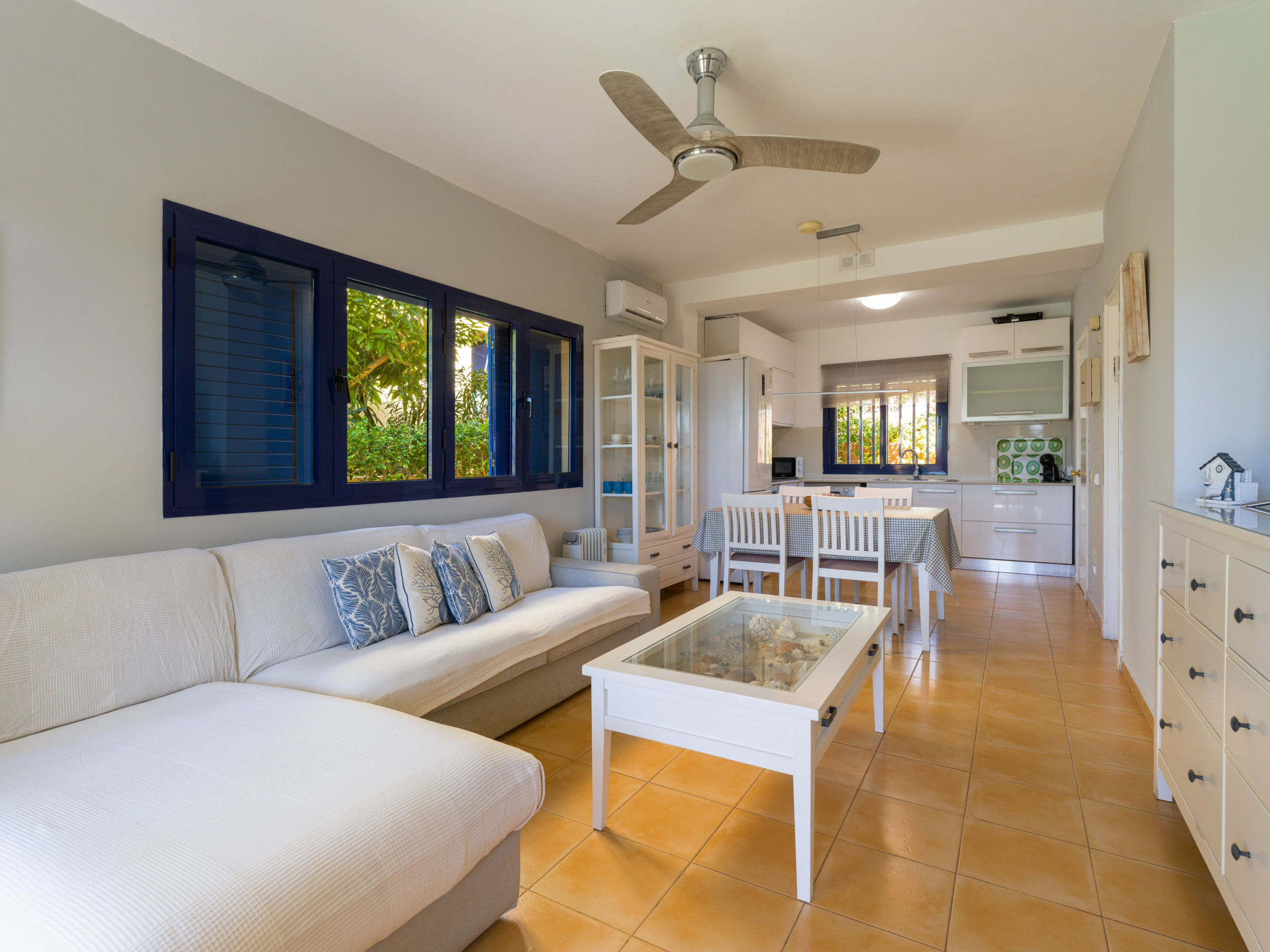 Es hat einen großen Garten mit Möbeln und Sonnenliegen, ideal zum Essen, Sonnenbaden und Entspannen. Das Grundstück ist eingezäunt und es gibt auch eine 10 m² große Terrasse auf der Rückseite. Es verfügt über alles, was Sie brauchen, um einen idealen Urlaub wie zu Hause zu verbringen, wie z.B. Bügeleisen, unbegrenzten Internetzugang (wifi), Haartrockner, Gemeinschaftspool und 2 Smart TVs. Die offene Küche ist mit dem Wohnzimmer verbunden und mit hochwertigen Geräten ausgestattet: Cerankochfeld, Kühlschrank, Mikrowelle, Backofen, Gefrierschrank, Waschmaschine, Geschirrspüler, Geschirr/Besteck, Küchenutensilien, Kaffeemaschine, Toaster, Wasserkocher und Saftpresse.