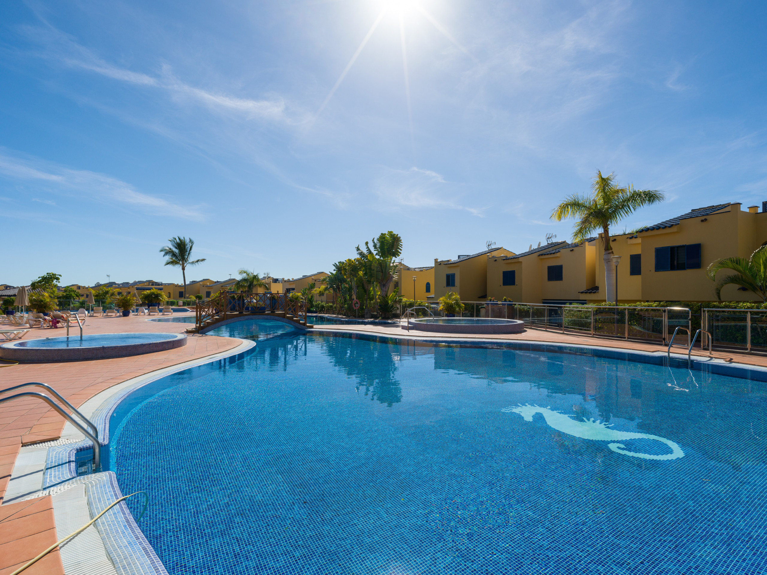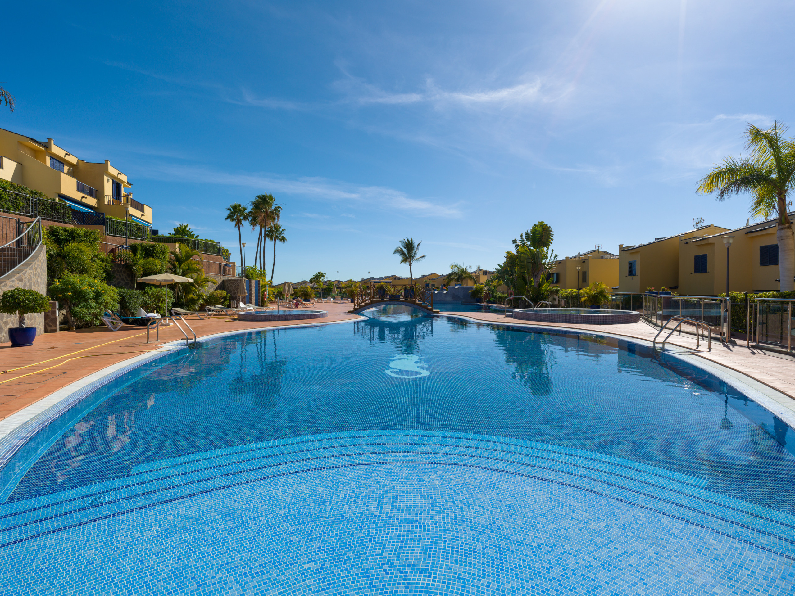 Das Gemeinschaftsschwimmbad und der Whirlpool sind nur einen Steinwurf vom Haus entfernt, das eine sehr ruhige Atmosphäre hat.