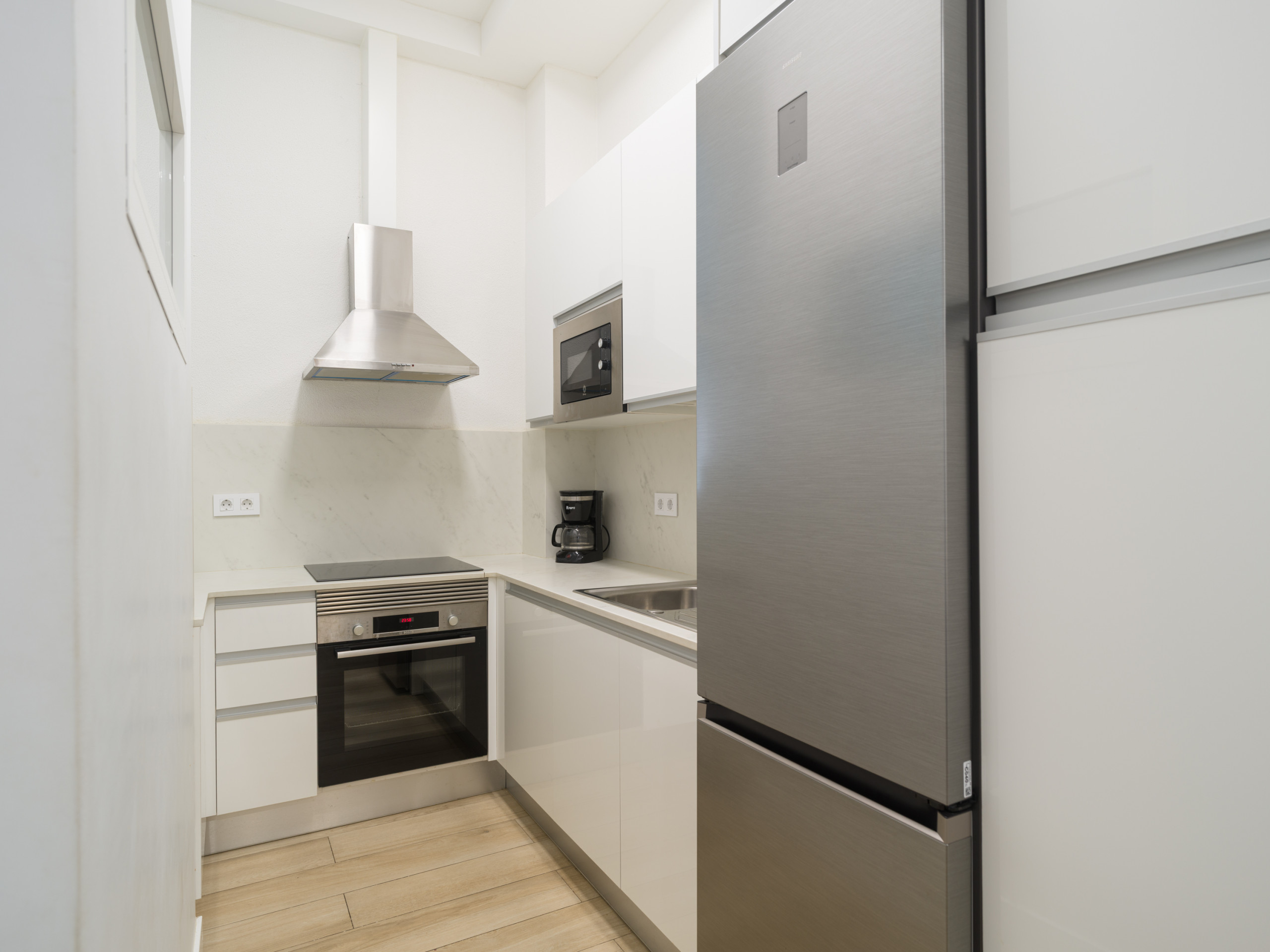 Die Einbauküche ist komplett mit modernsten Haushaltsgeräten ausgestattet, einschließlich Induktionsherd, Kühlschrank, Gefrierschrank, Waschmaschine, Backofen, Mikrowelle, Kaffeemaschine, Toaster, Wasserkocher, Entsafter und einer kompletten Ausstattung an Kochgeschirr und Küchenutensilien. Dies ermöglicht es den Gästen, Mahlzeiten zuzubereiten und gastronomische Momente zu genießen.