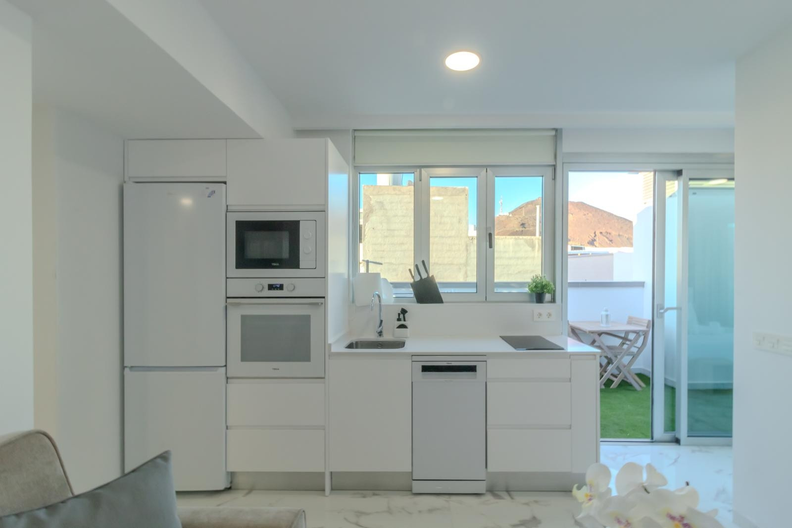 Die Wohnung verfügt über ein Hauptschlafzimmer, das mit einem Doppelbett ausgestattet ist und einen erholsamen Schlaf garantiert. Seine lichtdurchflutete amerikanische Küche ist komplett ausgestattet mit modernsten Haushaltsgeräten, einschließlich Waschmaschine, Geschirrspüler, Backofen, Mikrowelle, Kaffeemaschine und einer großen Auswahl an Küchenutensilien, die es Ihnen ermöglichen werden, köstliche Mahlzeiten zuzubereiten.