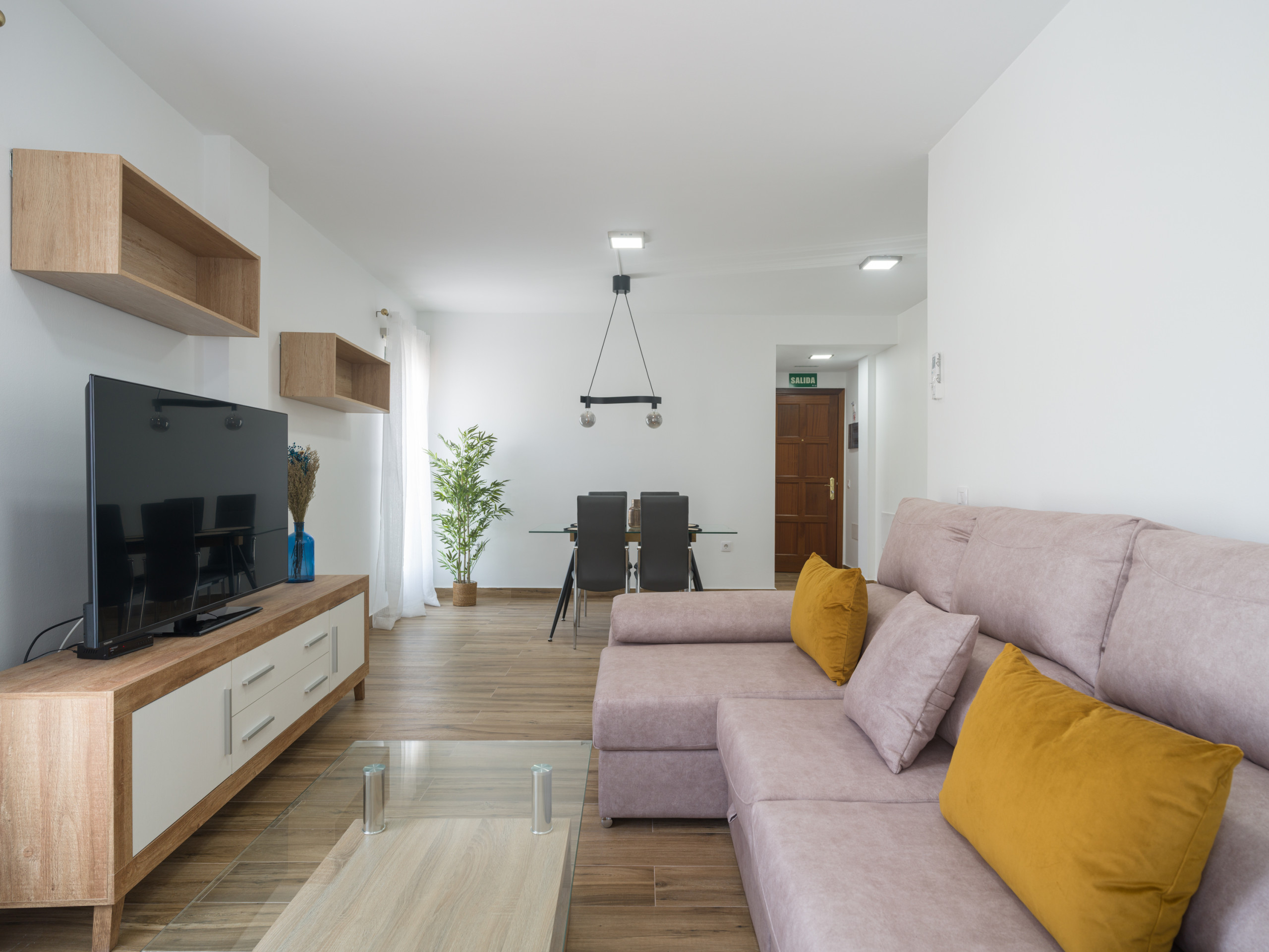El salón ofrece un espacio cómodo para el descanso, equipado con Smart TV y una distribución práctica que favorece la convivencia durante la estancia.