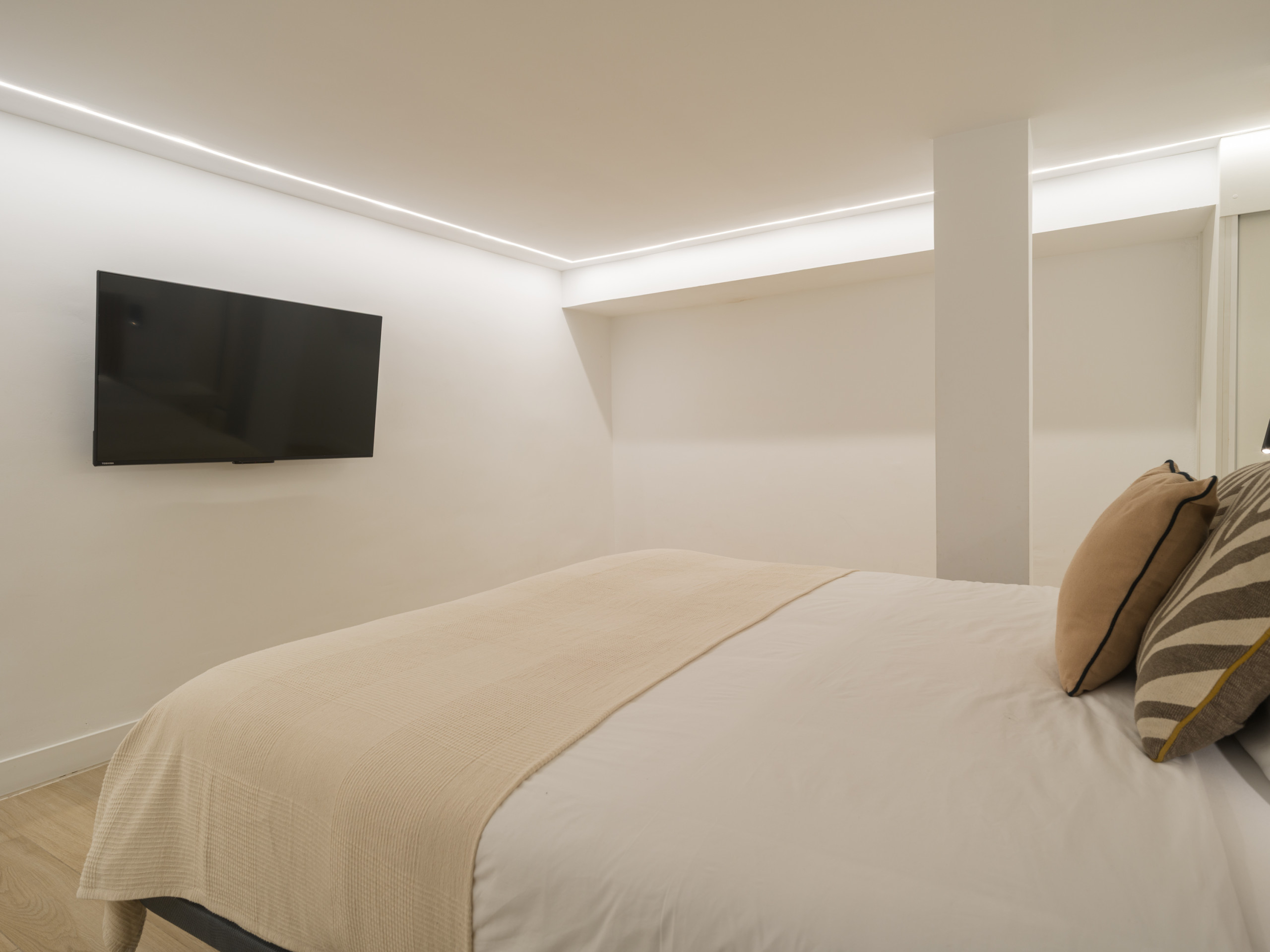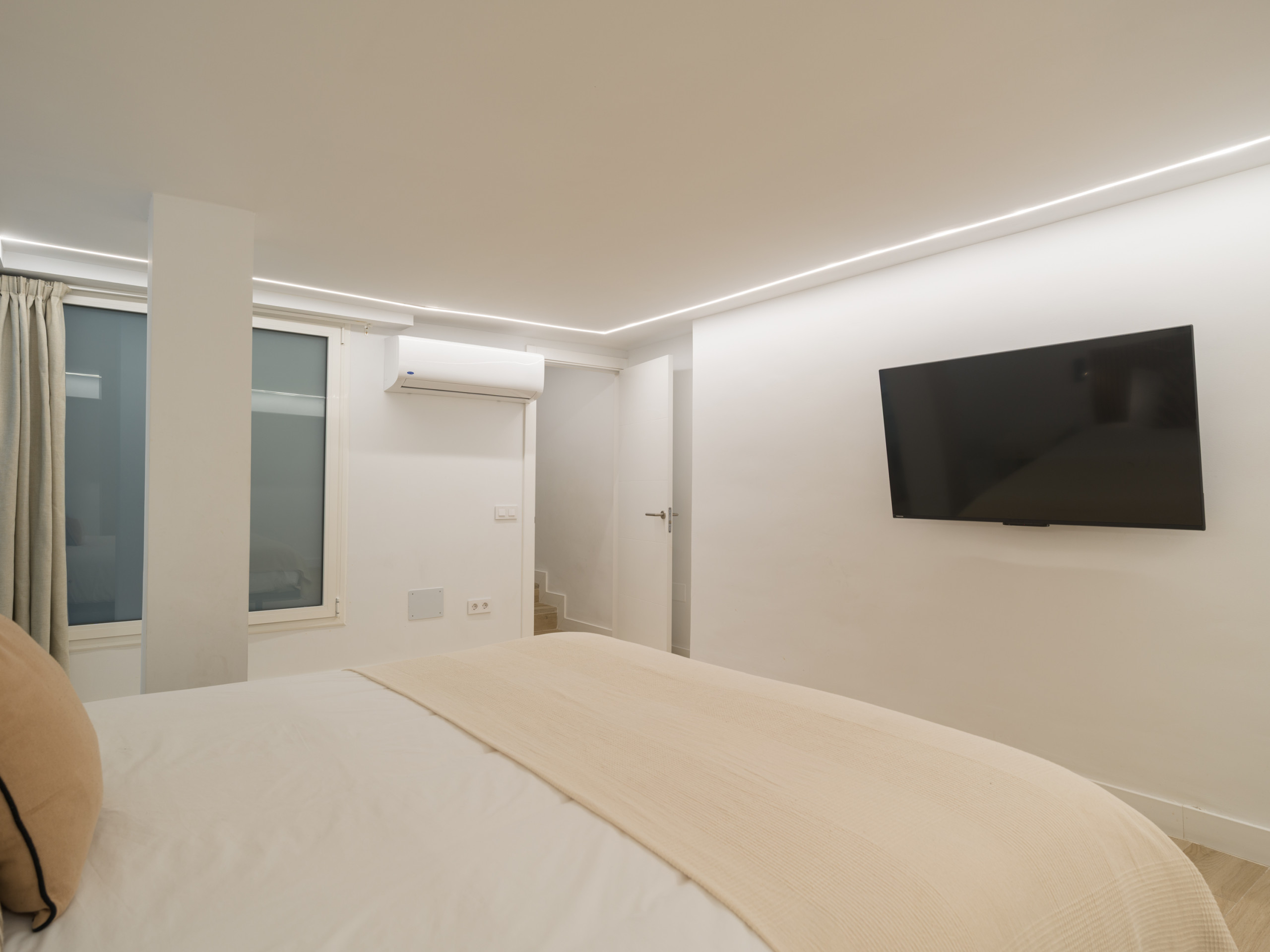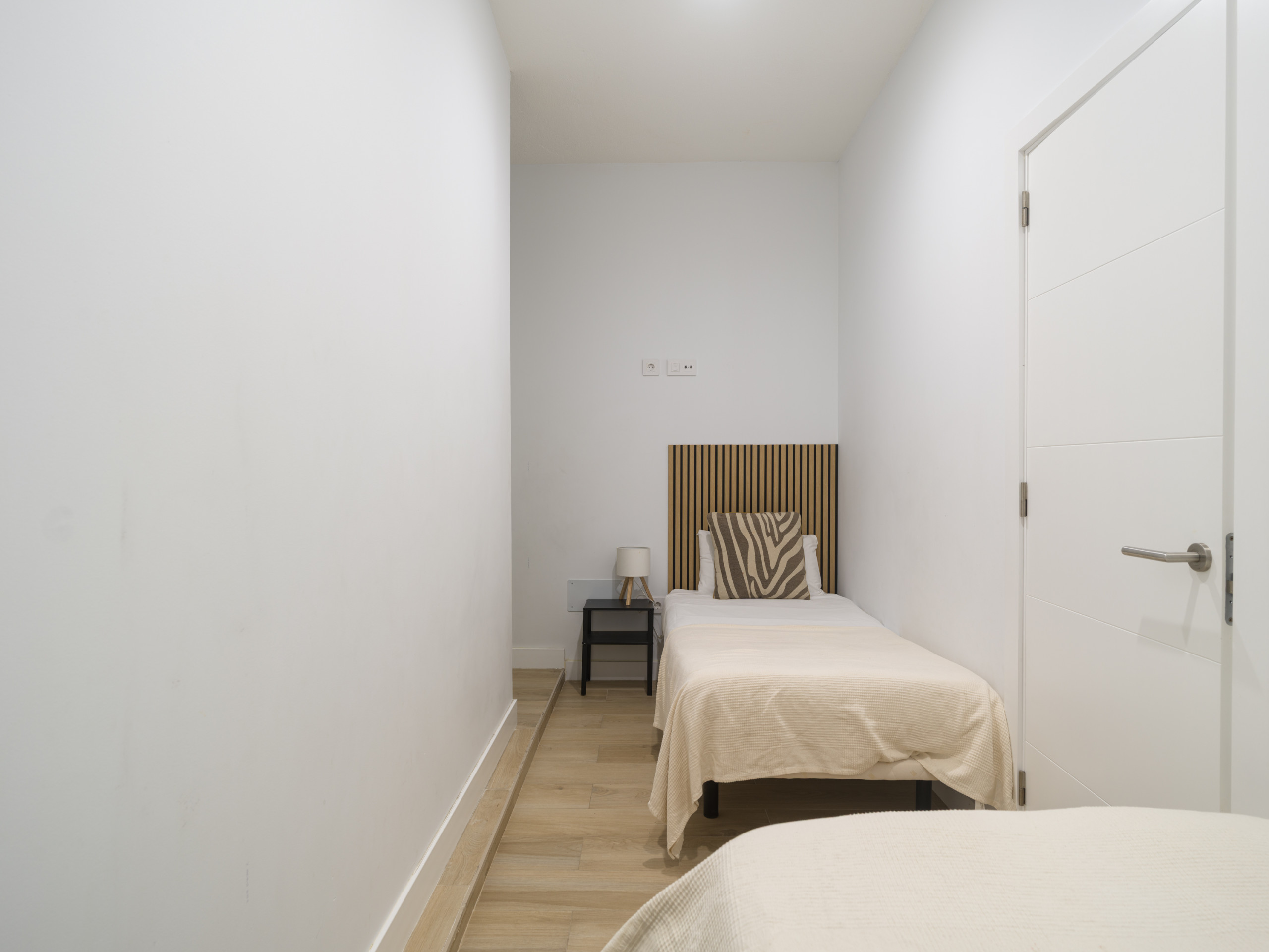 La vivienda cuenta con dos dormitorios, el primero con una cama queen size, al final de casa, para llegar a él hay que bajar dos peldaños, con un gran vestidor, smart tv y baño y el otro dos camas individuales, los cuales, ofrecen flexibilidad para diferentes configuraciones de huéspedes. Los dos baños con ducha garantizan comodidad y privacidad durante su estancia, un baño está en la suite y el otro en las zonas comunes.