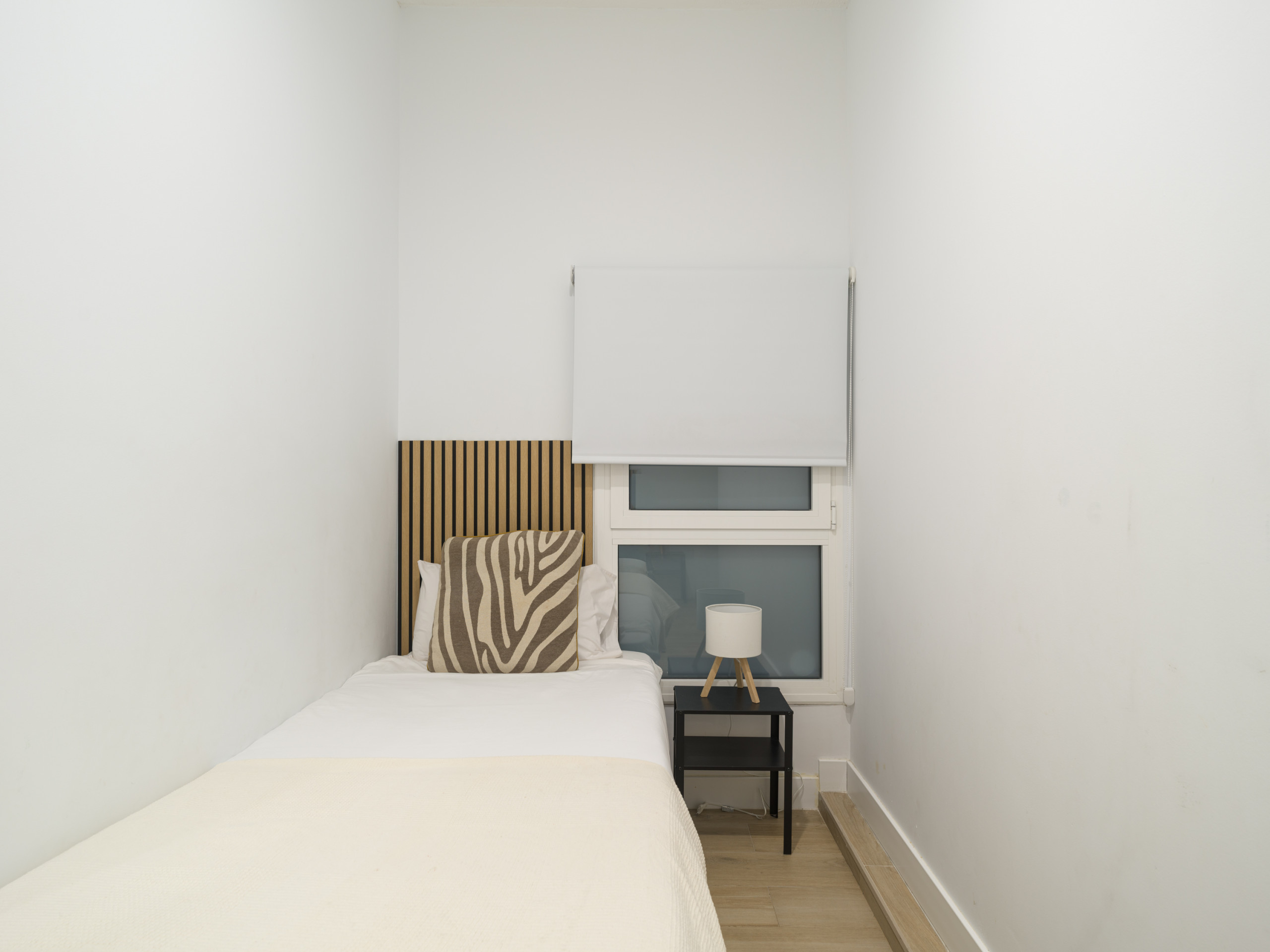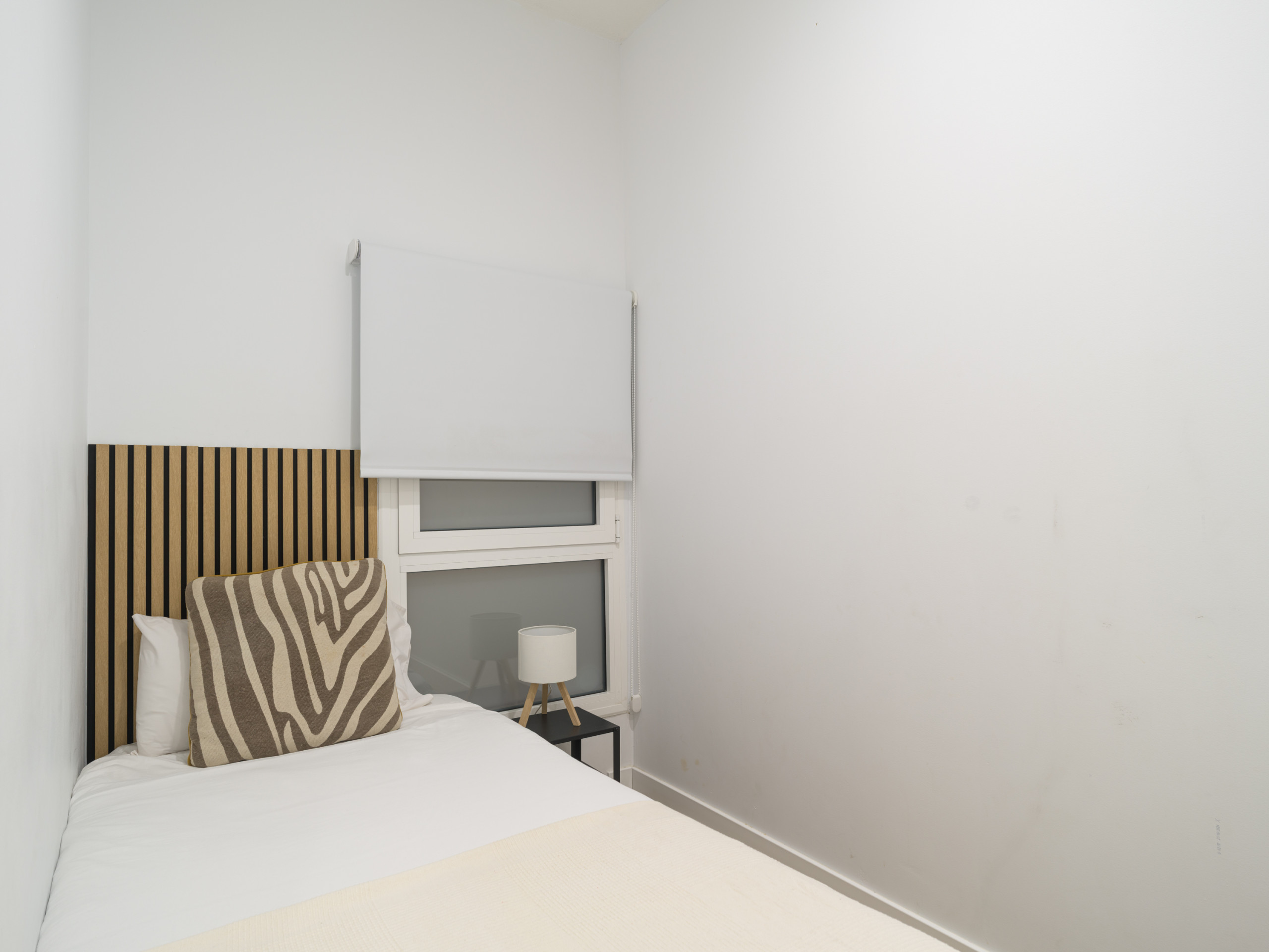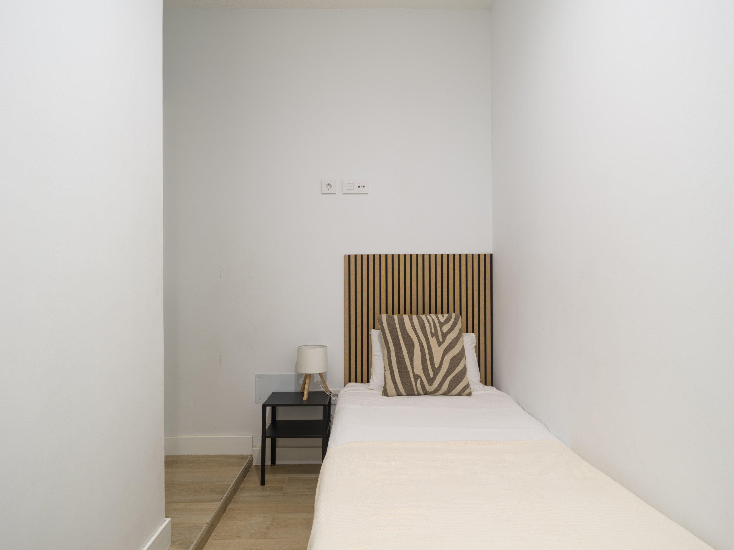 La vivienda cuenta con dos dormitorios, el primero con una cama queen size, al final de casa, para llegar a él hay que bajar dos peldaños, con un gran vestidor, smart tv y baño y el otro dos camas individuales, los cuales, ofrecen flexibilidad para diferentes configuraciones de huéspedes. Los dos baños con ducha garantizan comodidad y privacidad durante su estancia, un baño está en la suite y el otro en las zonas comunes.