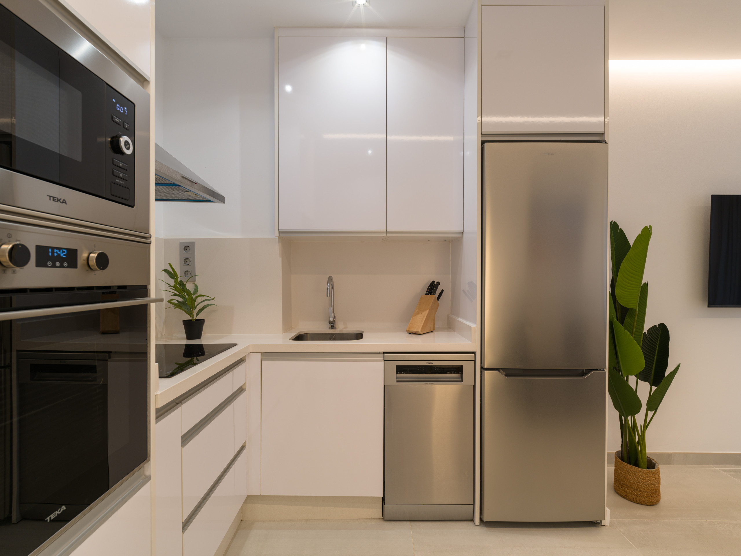 La cocina americana está completamente equipada con electrodomésticos modernos, incluyendo nevera, congelador, lavadora, secadora, lavavajillas, microondas, horno, cafetera, tostadora y hervidor. Encontrarás todos los utensilios de cocina necesarios para preparar comidas deliciosas durante tu estancia.