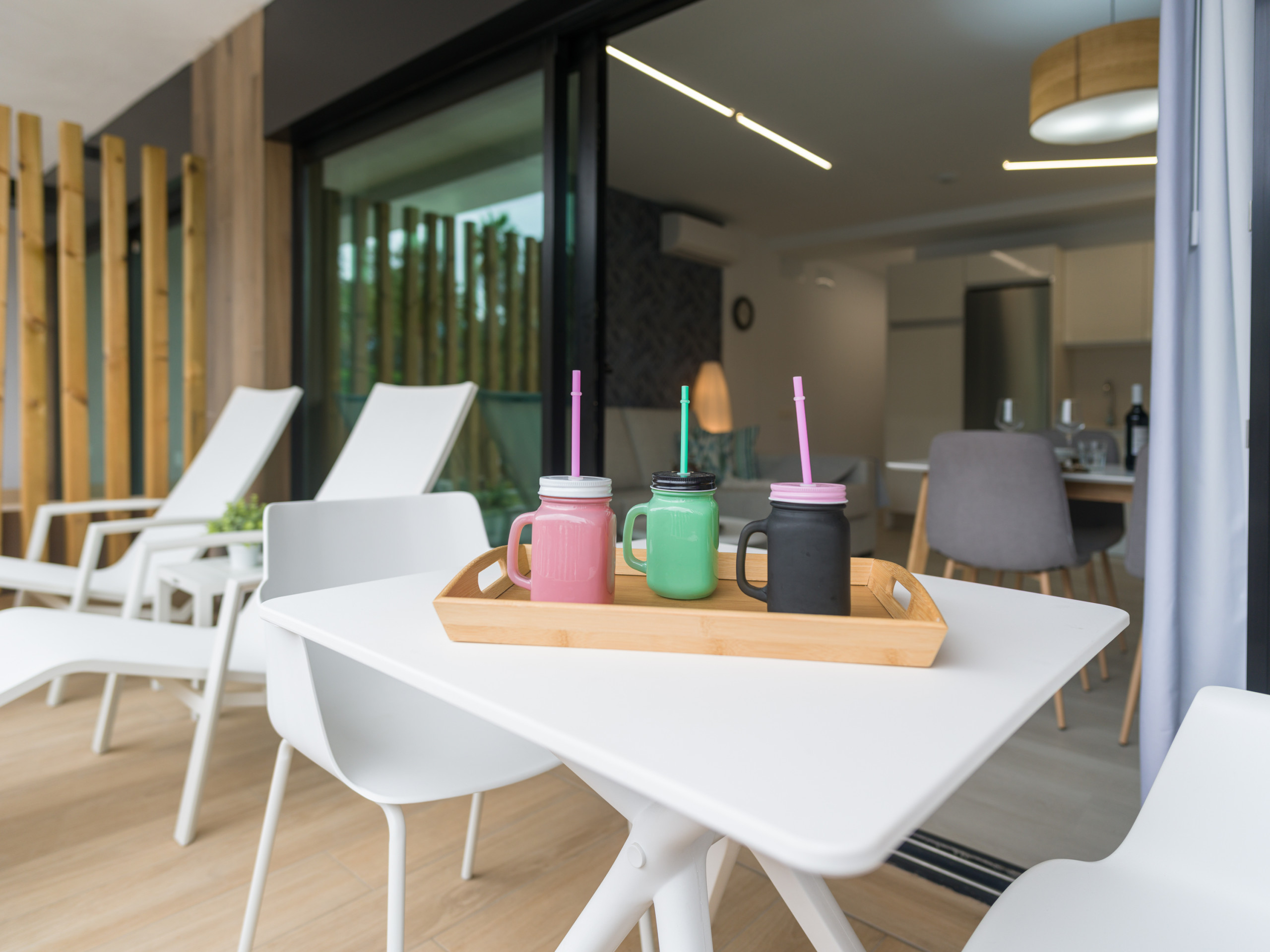 Lo más destacado de esta casa de vacaciones es su enorme terraza, que ofrece vistas panorámicas a la playa, las montañas y la piscina. Ya sea que esté tomando un café por la mañana, disfrutando de una puesta de sol o cenando al aire libre, la terraza es el lugar perfecto para disfrutar del impresionante entorno. Además, desde casi cualquier rincón de la casa se puede disfrutar de estupendas vistas a la playa.