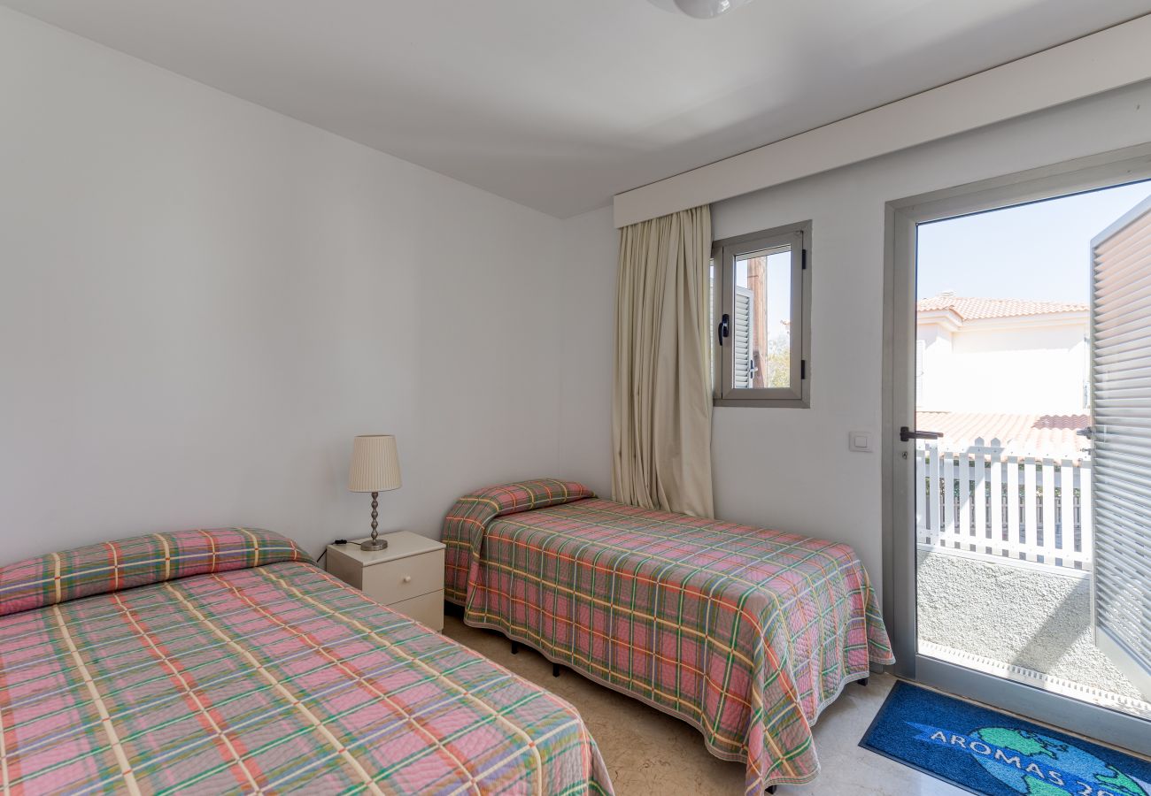 - La planta principal cuenta con salón comedor, cocina con lavavajillas, terraza privada con acceso directo a la piscina comunitaria y zona de comedor exterior y un dormitorio con 2 camas individuales.