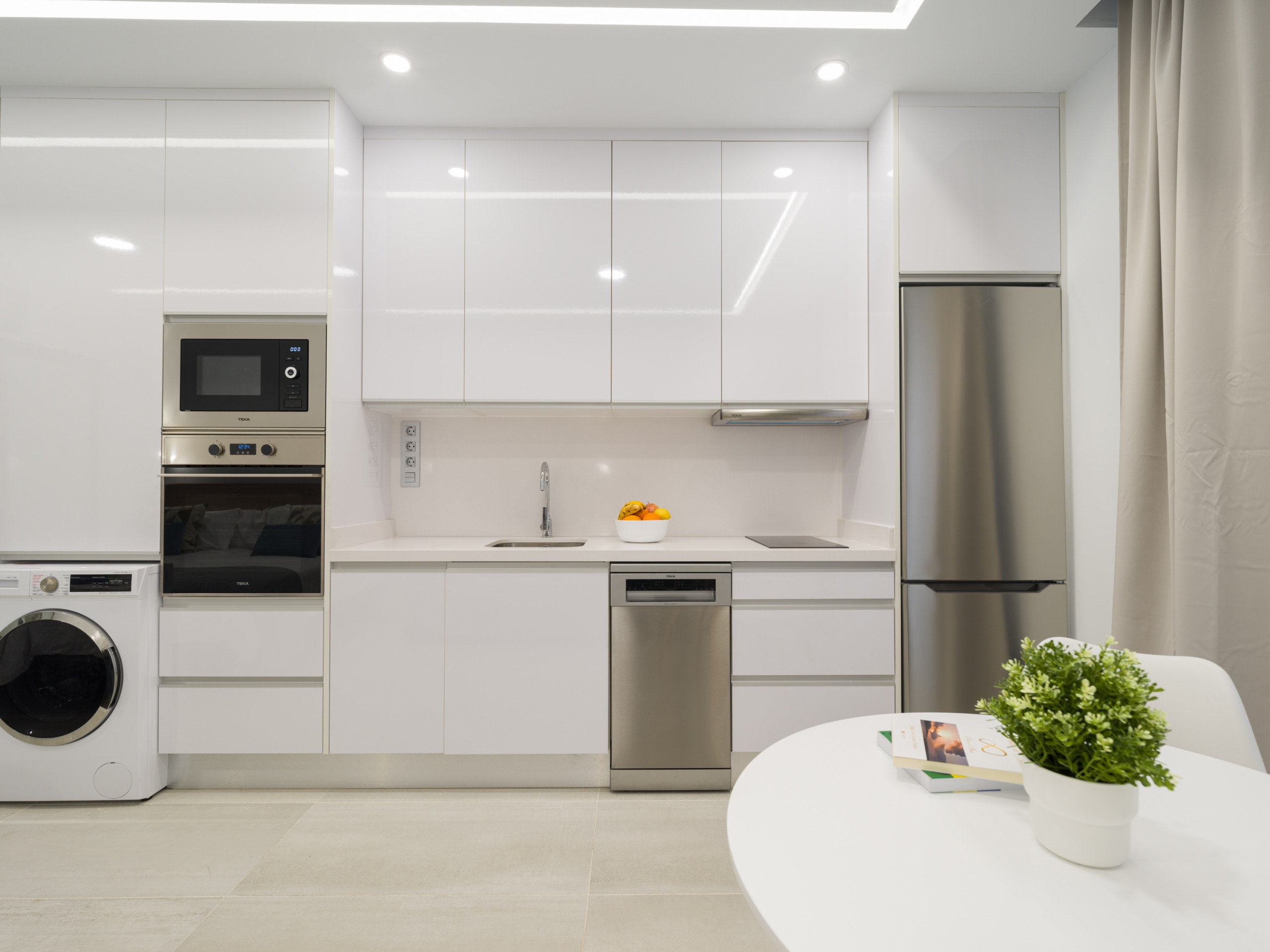 La cocina está completamente equipada con frigorífico combi, lavadora y secadora, horno, microondas, cafetera de cápsulas y pequeños electrodomésticos.