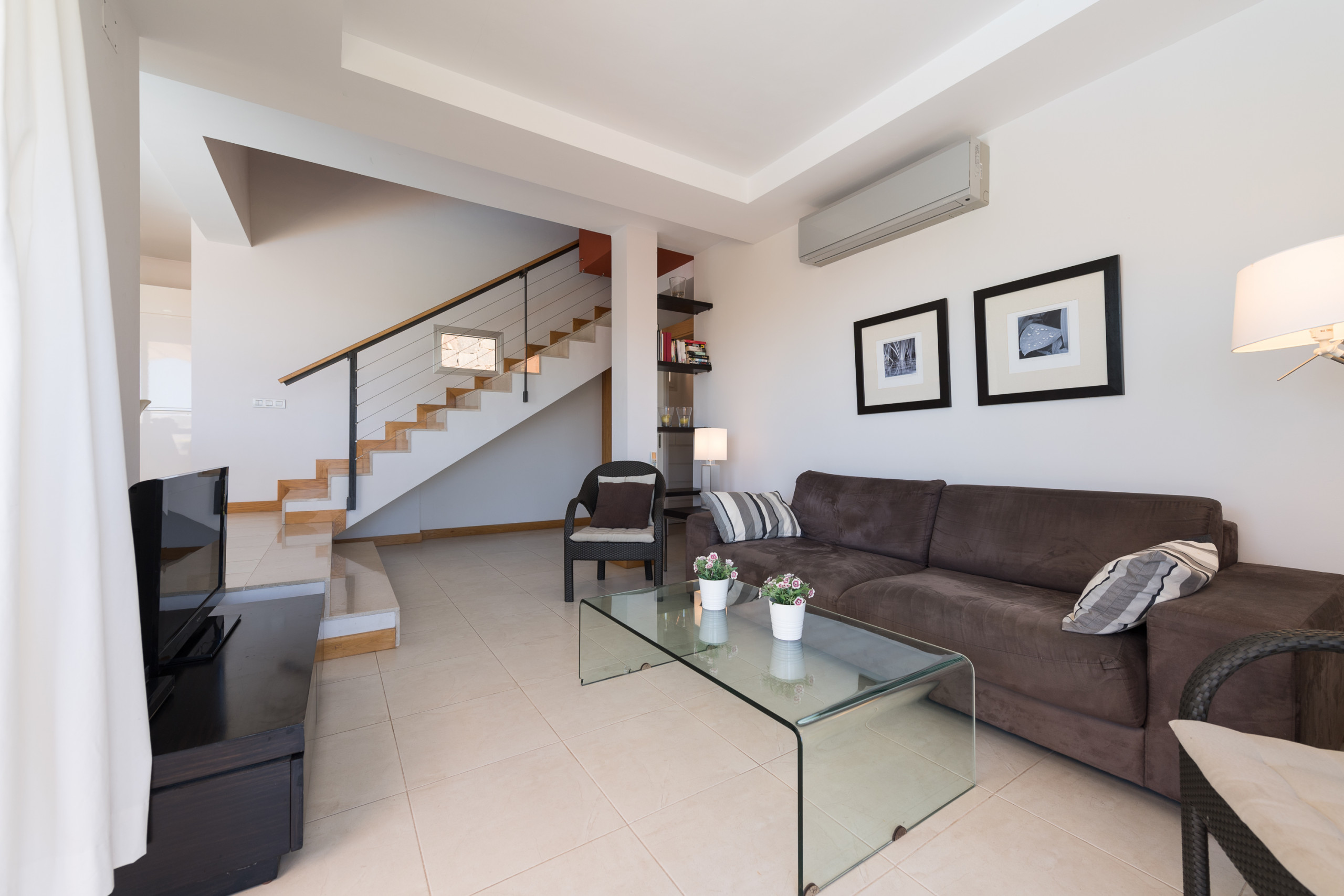 Cuenta con dos amplias habitaciones dobles, una con cama de matrimonio en el primer piso, que tiene acceso directo al jardín y la piscina. El otro dormitorio, ubicado en el segundo piso, tiene dos camas individuales con acceso directo a una fantástica terraza solarium con vistas panorámicas. Ambas habitaciones están equipadas con aire acondicionado (frío-calor) y baño privado.