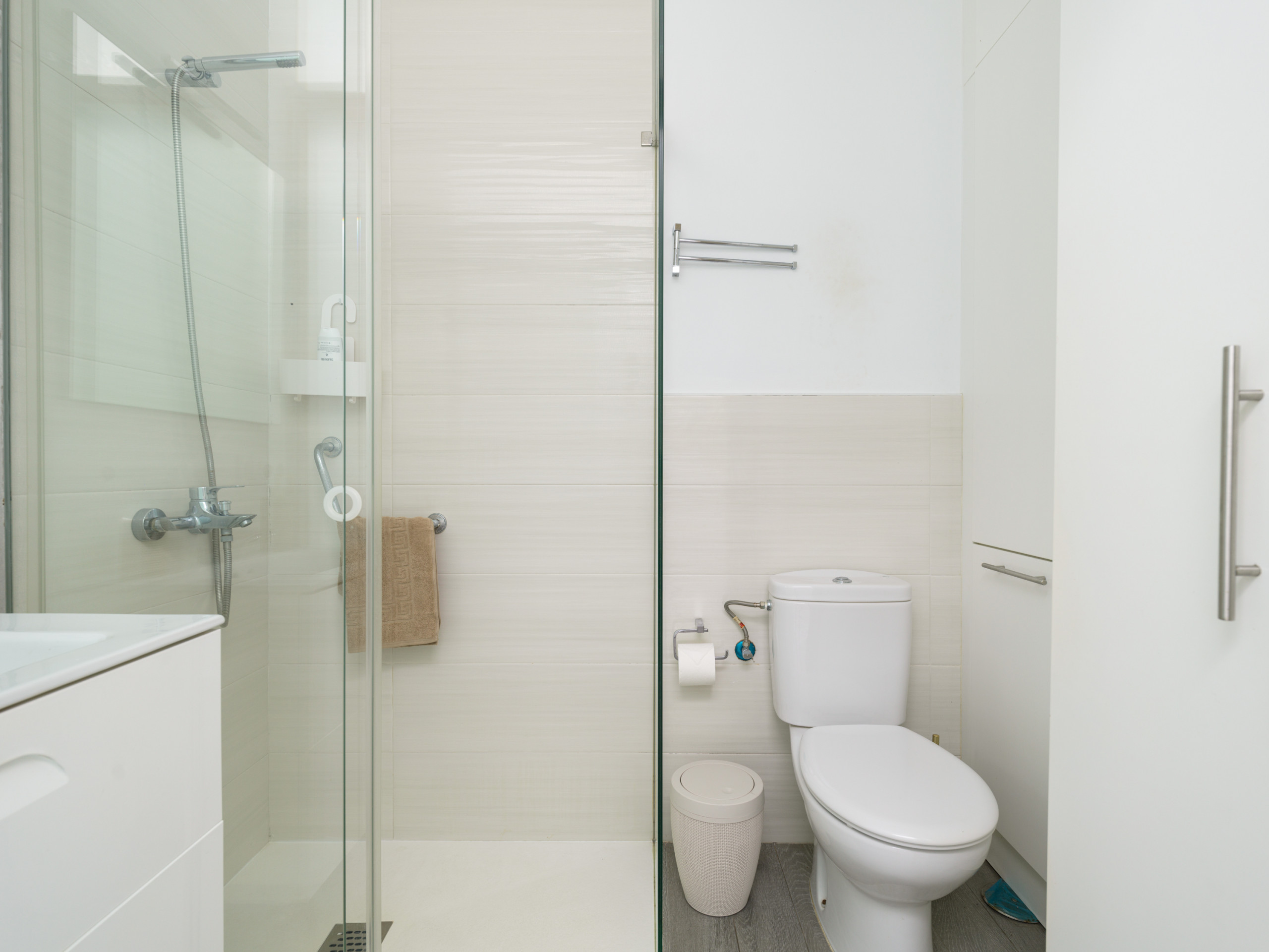 La salle de bain privée avec douche offre des commodités essentielles et dispose de caractéristiques écologiques comme des toilettes à faible consommation d'eau. L'appartement comprend des détails tels qu'une télévision intelligente, une connexion WiFi, un fer à repasser, une radio et un espace de vie avec un canapé pour un confort maximal.