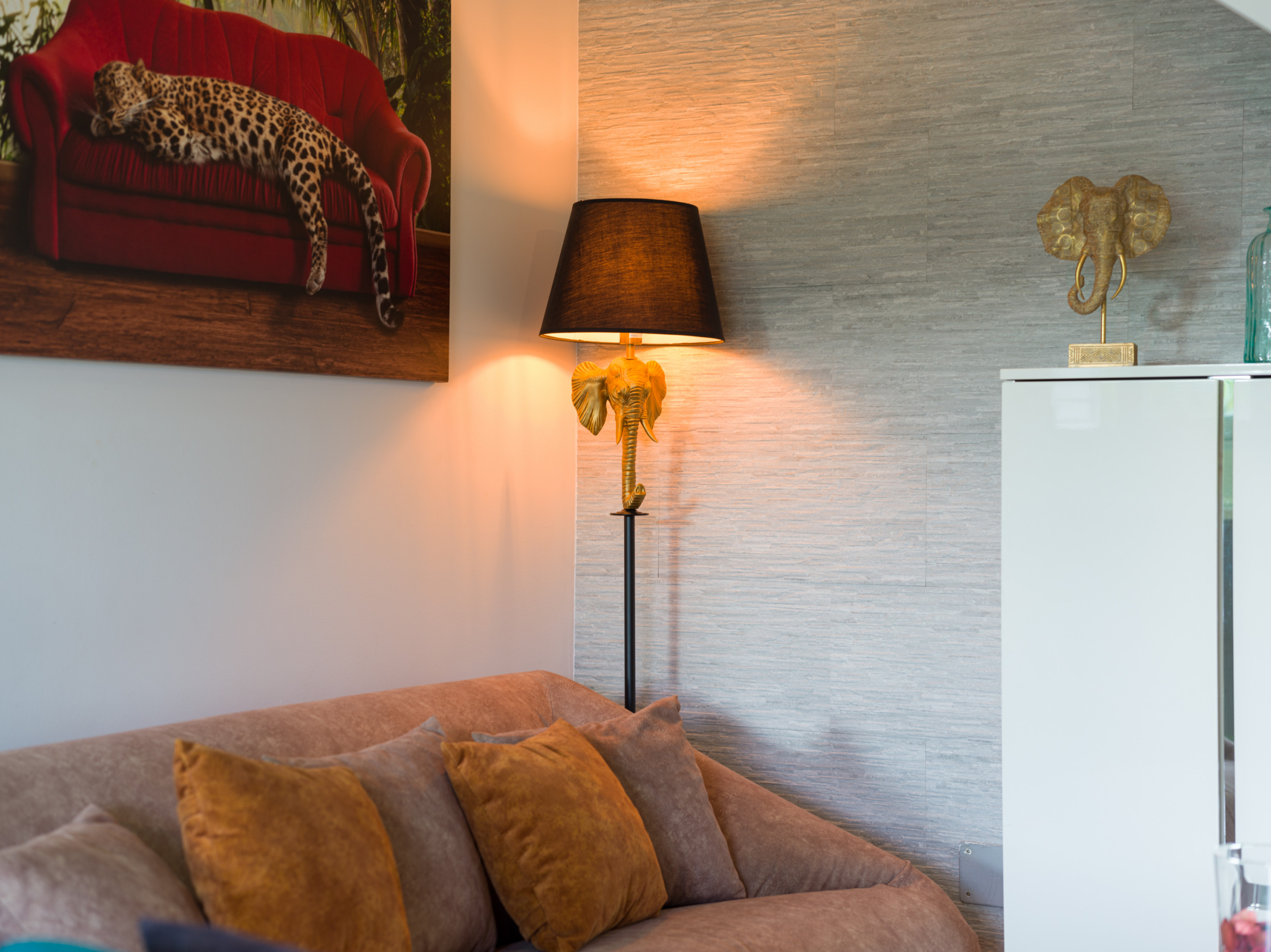 Le salon dispose également d'une grande table à manger ronde ainsi que d'un petit espace de travail avec table et chaise pour travailler confortablement.