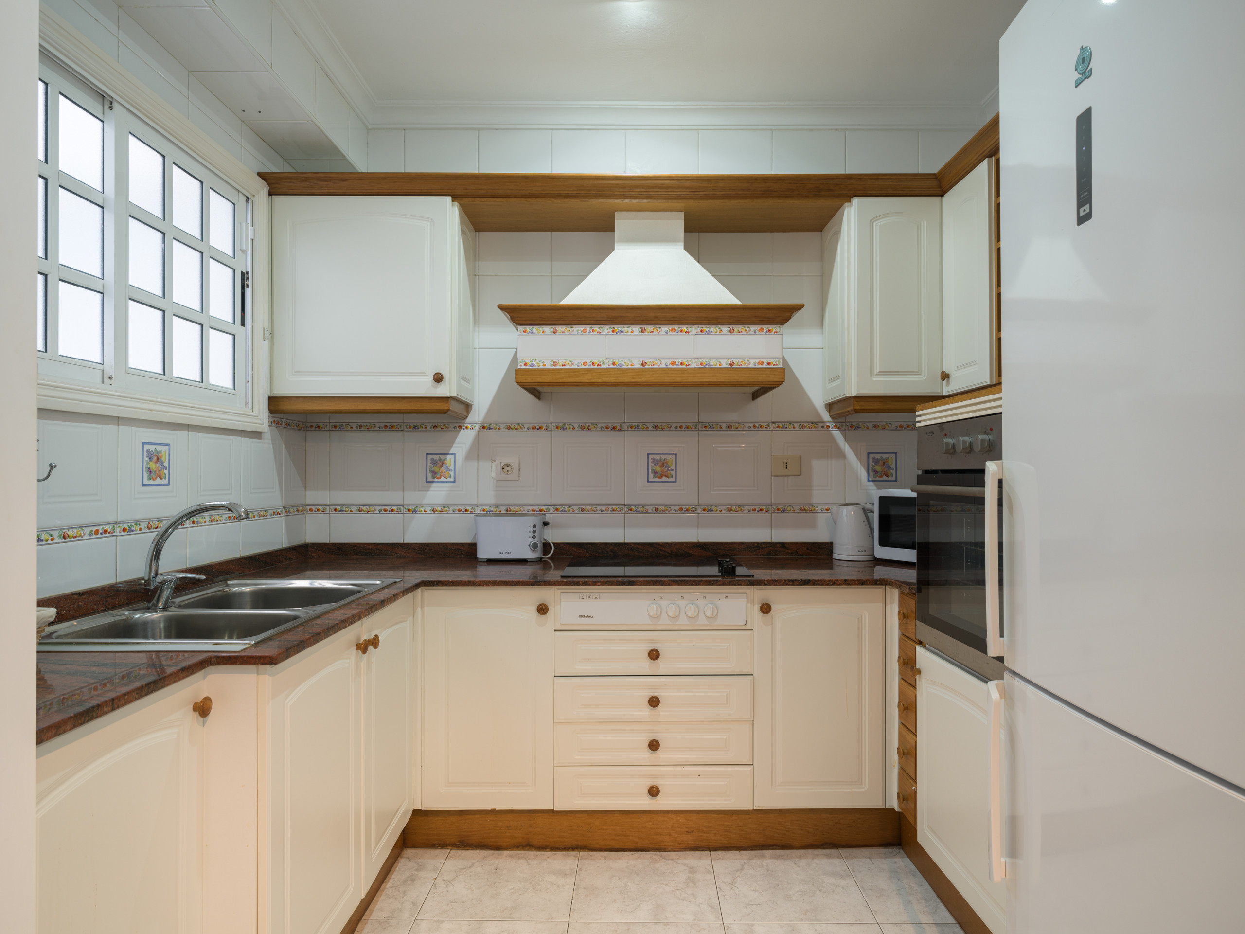 La cucina è completamente attrezzata con elettrodomestici essenziali come frigorifero, congelatore, lavatrice, forno, microonde, tostapane, macchina da caffè, bollitore elettrico e stoviglie complete. Ideale per preparare pasti e godersi momenti gastronomici durante il viaggio.