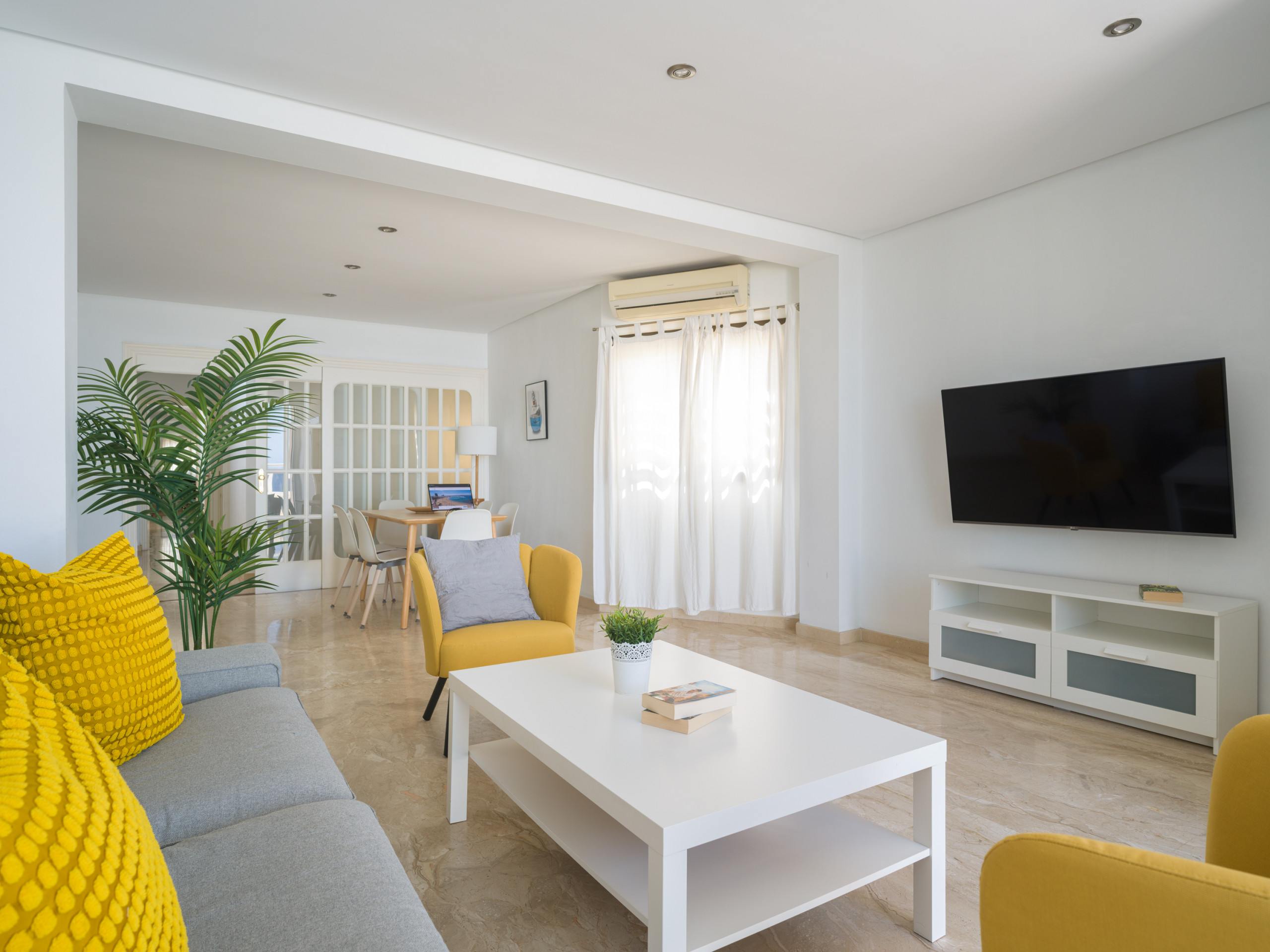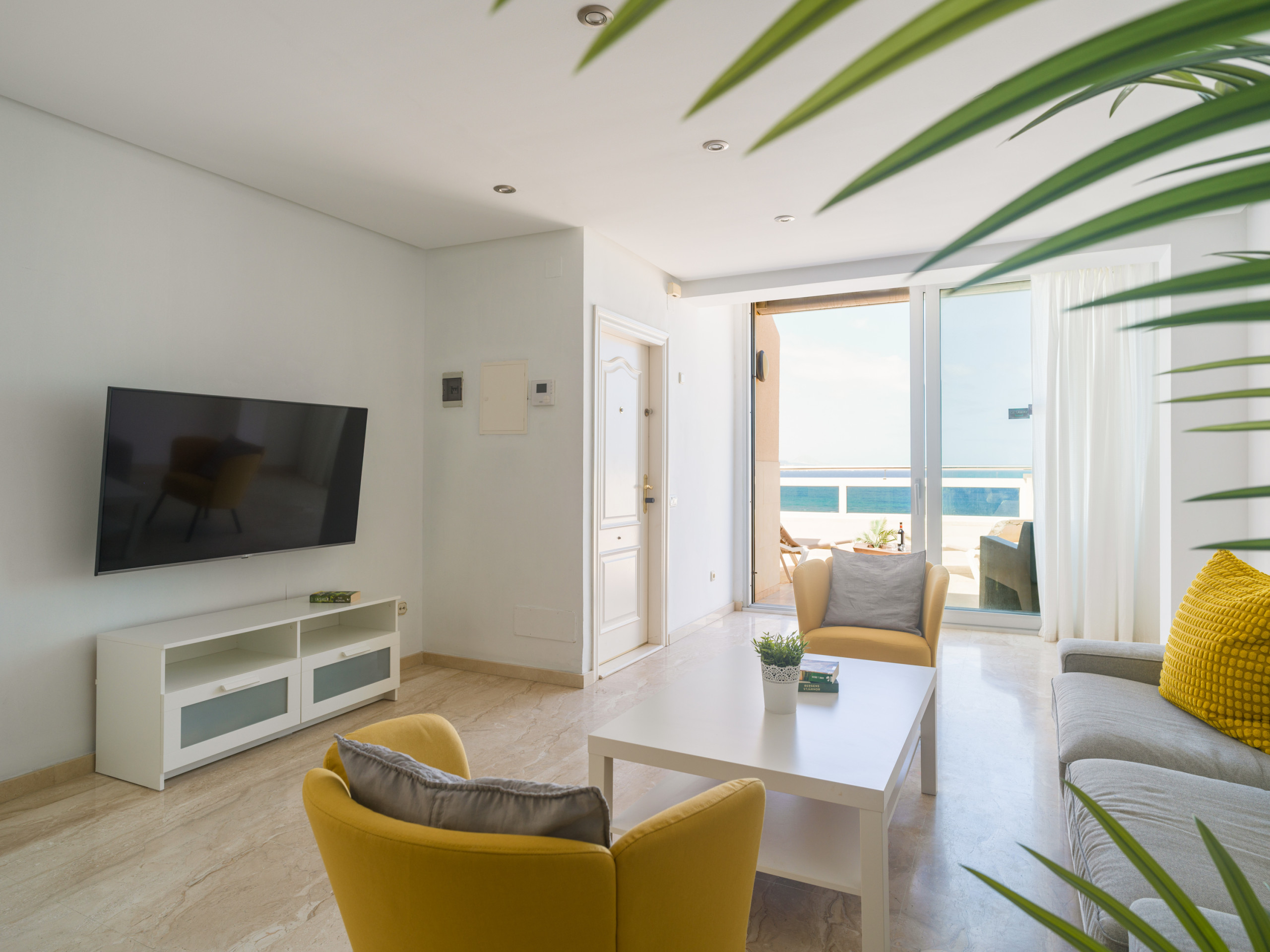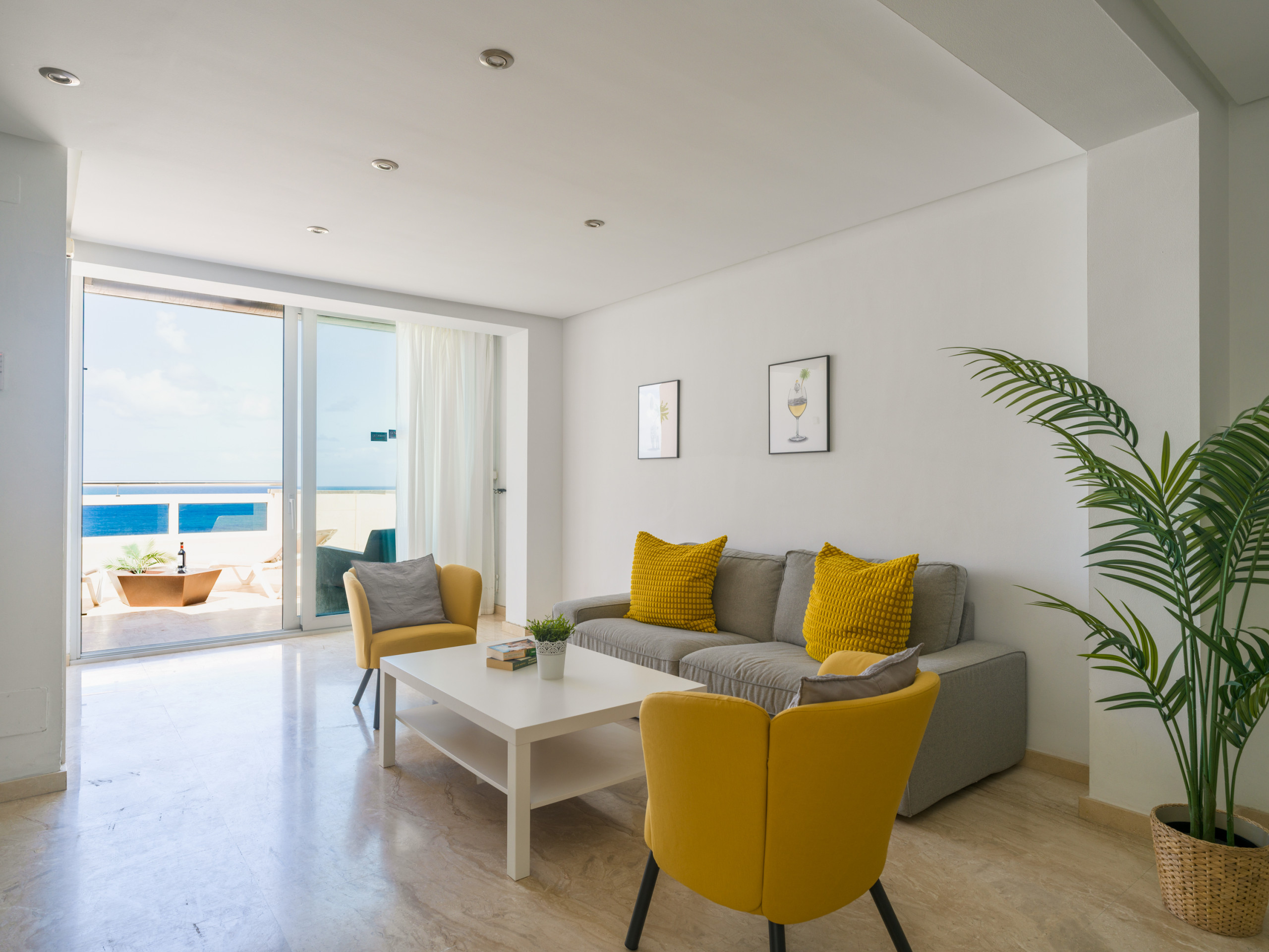 Quando si entra nell'edificio, si devono salire 6 gradini per raggiungere l'ascensore, mentre all'ultimo piano ci sono dodici gradini per raggiungere il favoloso attico. Entrando, noterete un luminoso soggiorno con grandi finestre che lasciano entrare la luce naturale. I toni neutri e l'arredamento contemporaneo creano un'atmosfera accogliente e rilassante. La sala da pranzo dispone di un grande tavolo da pranzo con sei comode sedie, oltre a comodi divani, una Smart TV e l'aria condizionata, perfetti per rilassarsi dopo una giornata trascorsa a esplorare l'isola,