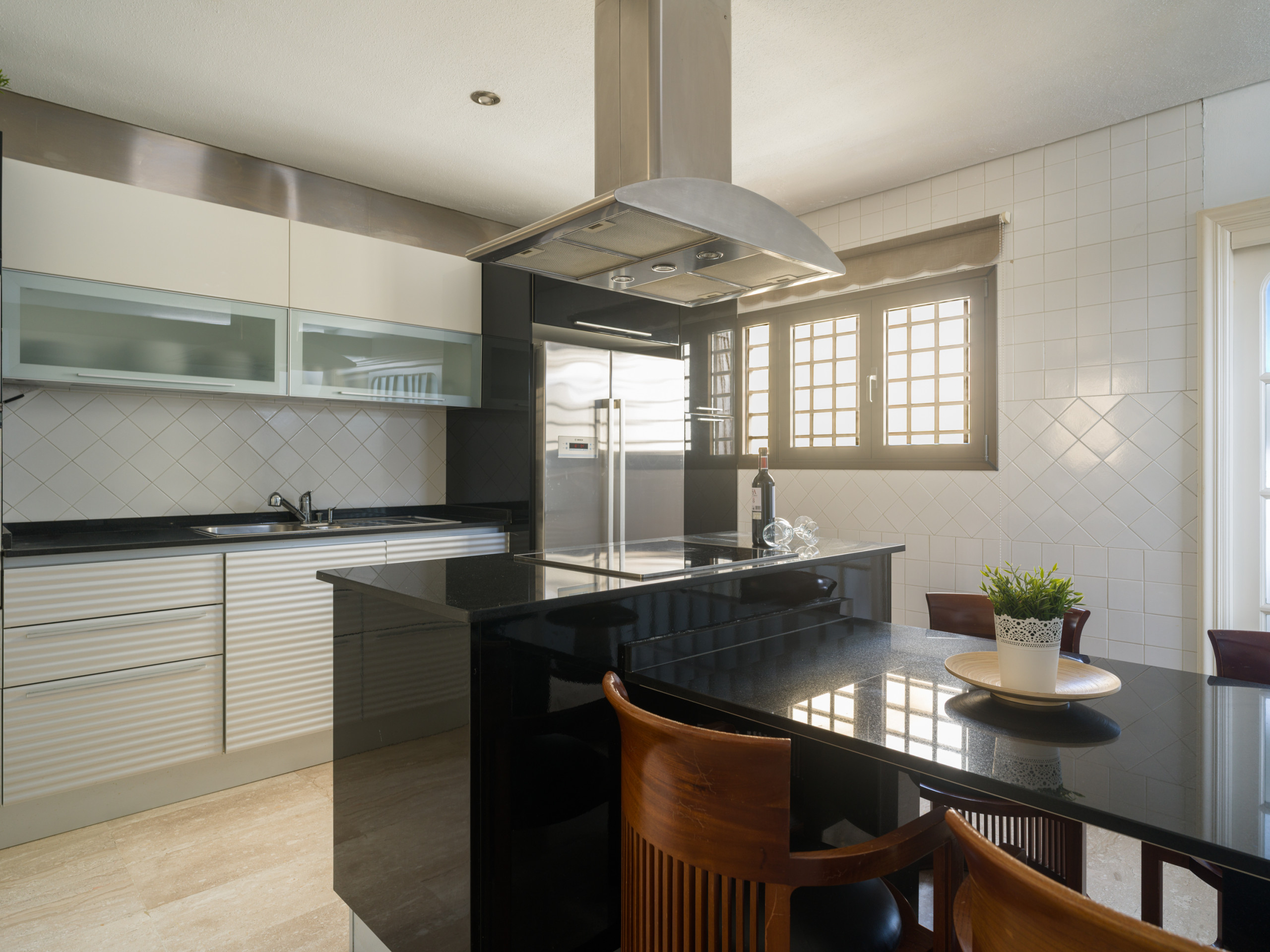 La cucina completamente attrezzata ha un design elegante e dispone di elettrodomestici moderni come frigorifero, forno, microonde, lavastoviglie e piccoli elettrodomestici. Dispone inoltre di un'isola e di un ampio bar con quattro comodi sgabelli. Gli ospiti hanno a disposizione tutto il necessario per preparare qualsiasi tipo di pasto e gustarlo nell'adiacente sala da pranzo, che offre uno spazio accogliente per riunirsi intorno al tavolo e si affaccia sul mare.