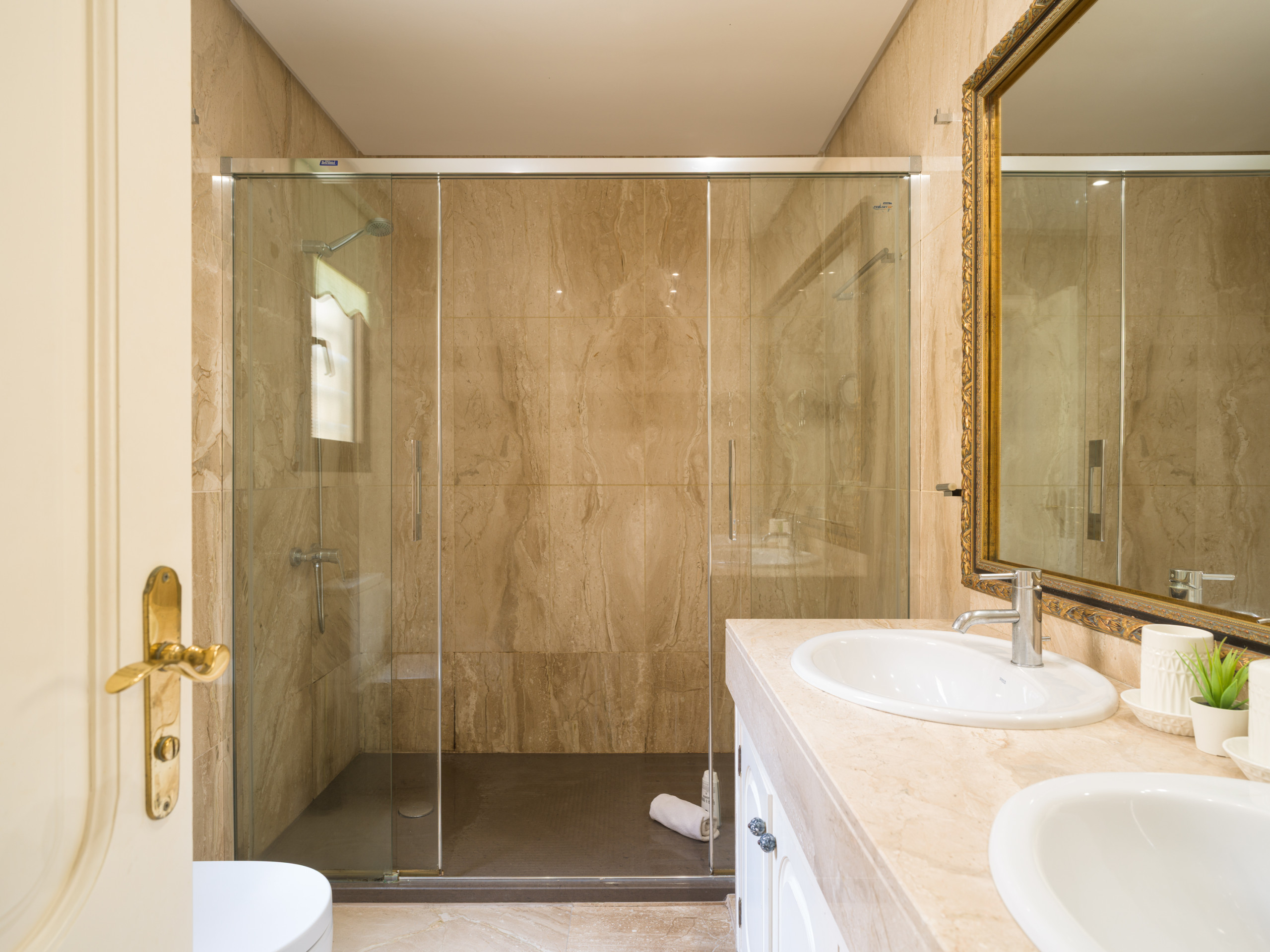 Ci sono due eleganti bagni in marmo, dotati di piatti doccia, WC, bidet e doppio lavabo, ampi specchi, asciugacapelli e un set completo di morbidi e soffici asciugamani.