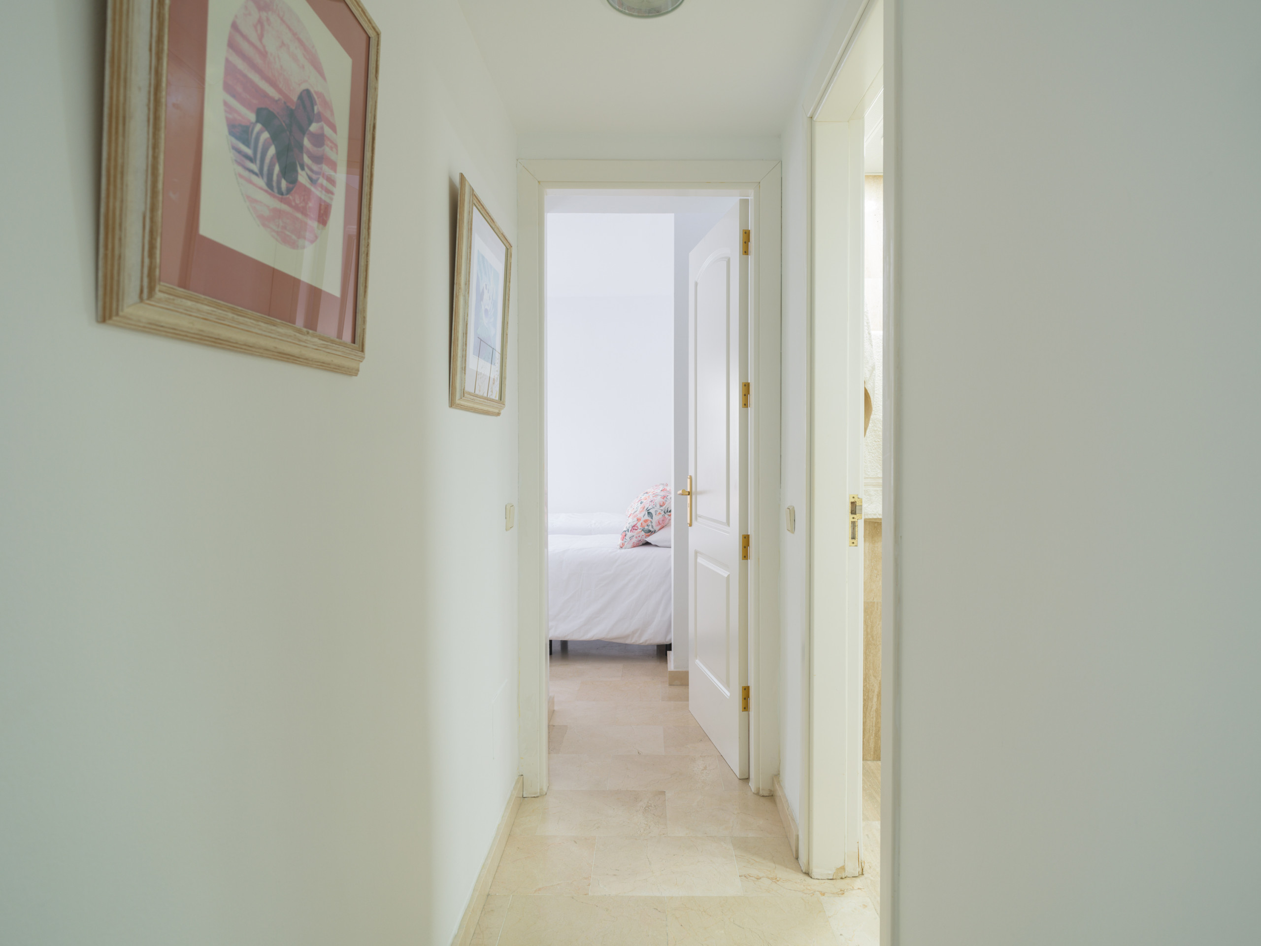 L'alloggio dispone di 2 camere da letto con vista laterale sul mare (una con due letti singoli e l'altra con un letto a castello) e 1 bagno con doccia, con capacità per 4 persone. È completamente attrezzato con tutto il necessario per farti sentire a casa, inclusa una cucina indipendente con elettrodomestici moderni, un'area pranzo e un accogliente soggiorno con TV.