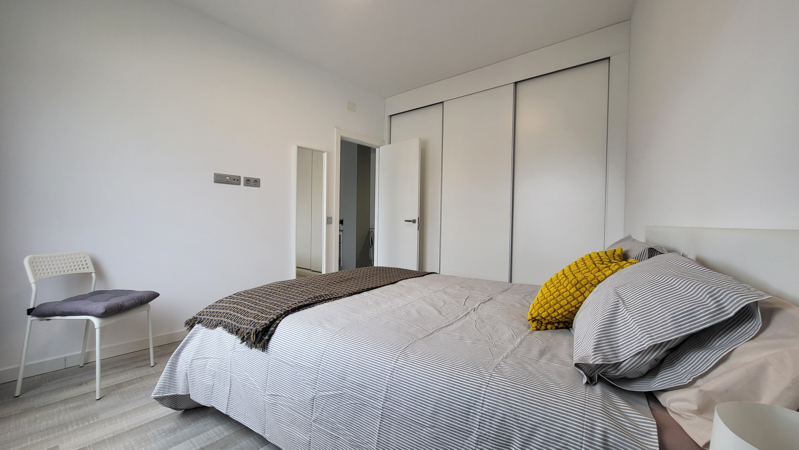 The main bedroom features a double bed and built-in wardrobes, providing ample storage space. It is equipped with hangers and includes an iron to keep your clothes immaculate. The room ensures restful relaxation after a day of work or sightseeing.