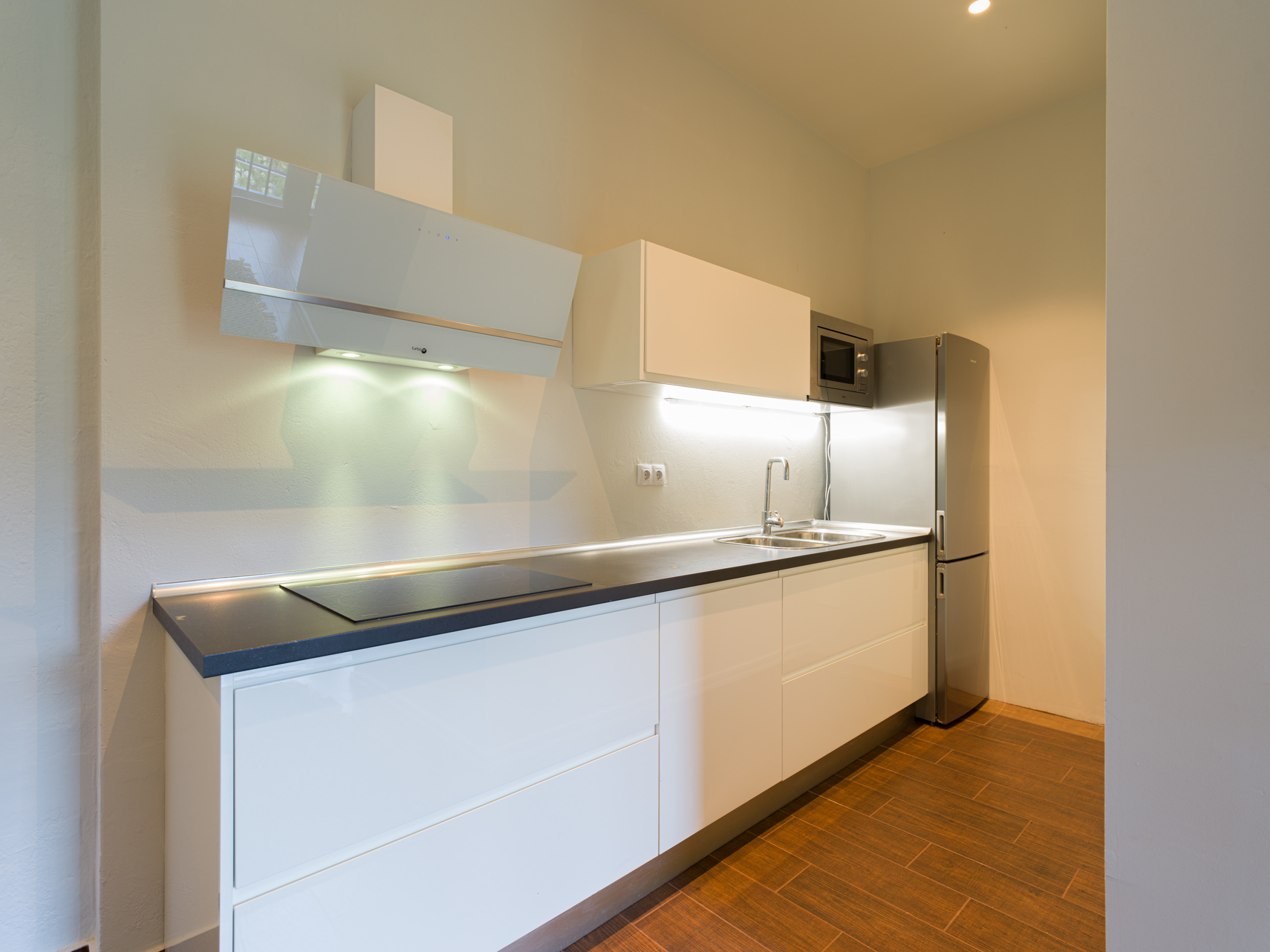 In the induction open plan kitchen, refrigerator, microwave, oven, freezer and kitchen utensils are provided.