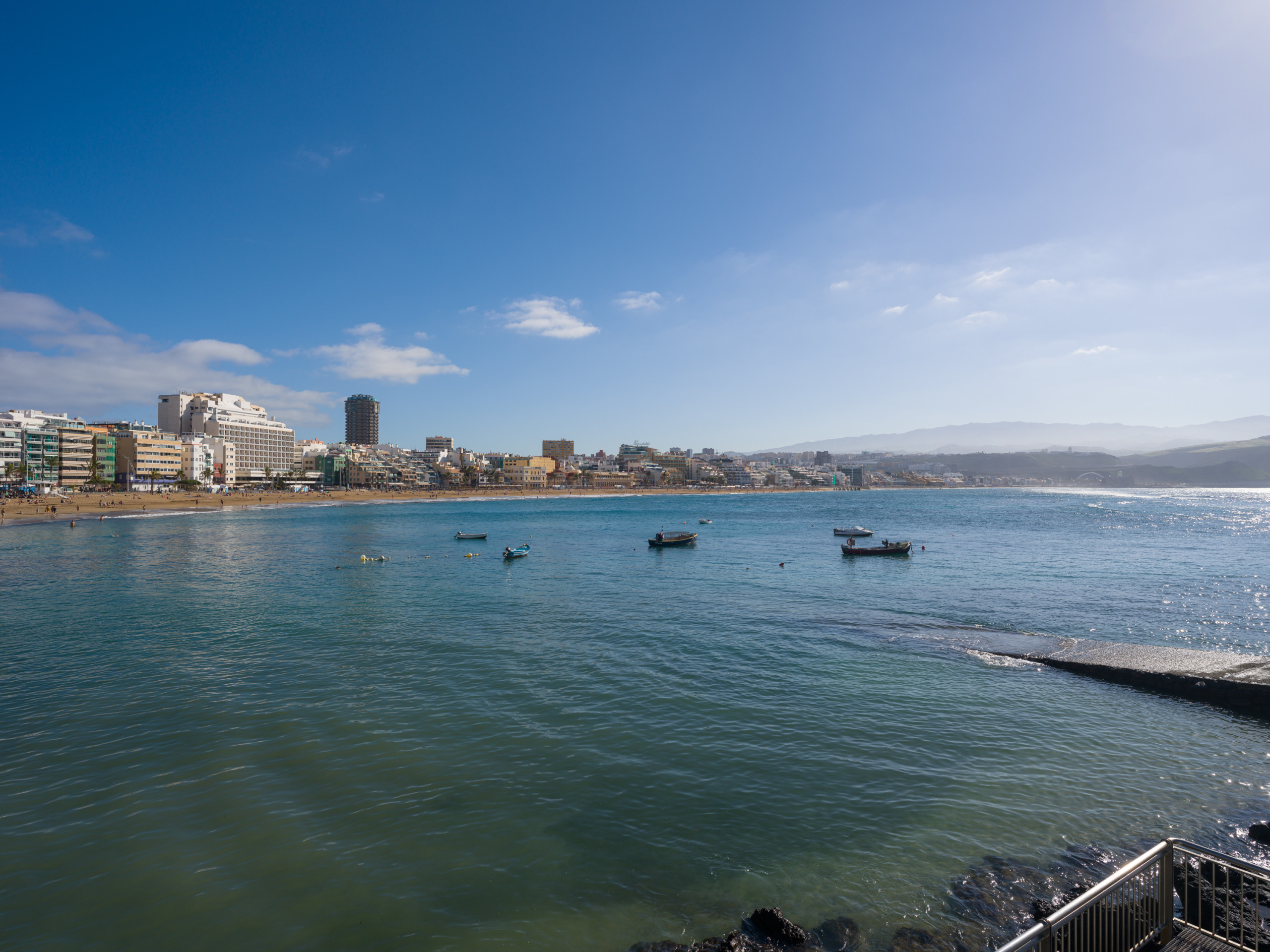 "La Playa de Las Canteras" is a long stretch of sand, occupying about 3800 meters of coastline, which stretches across the bay.
