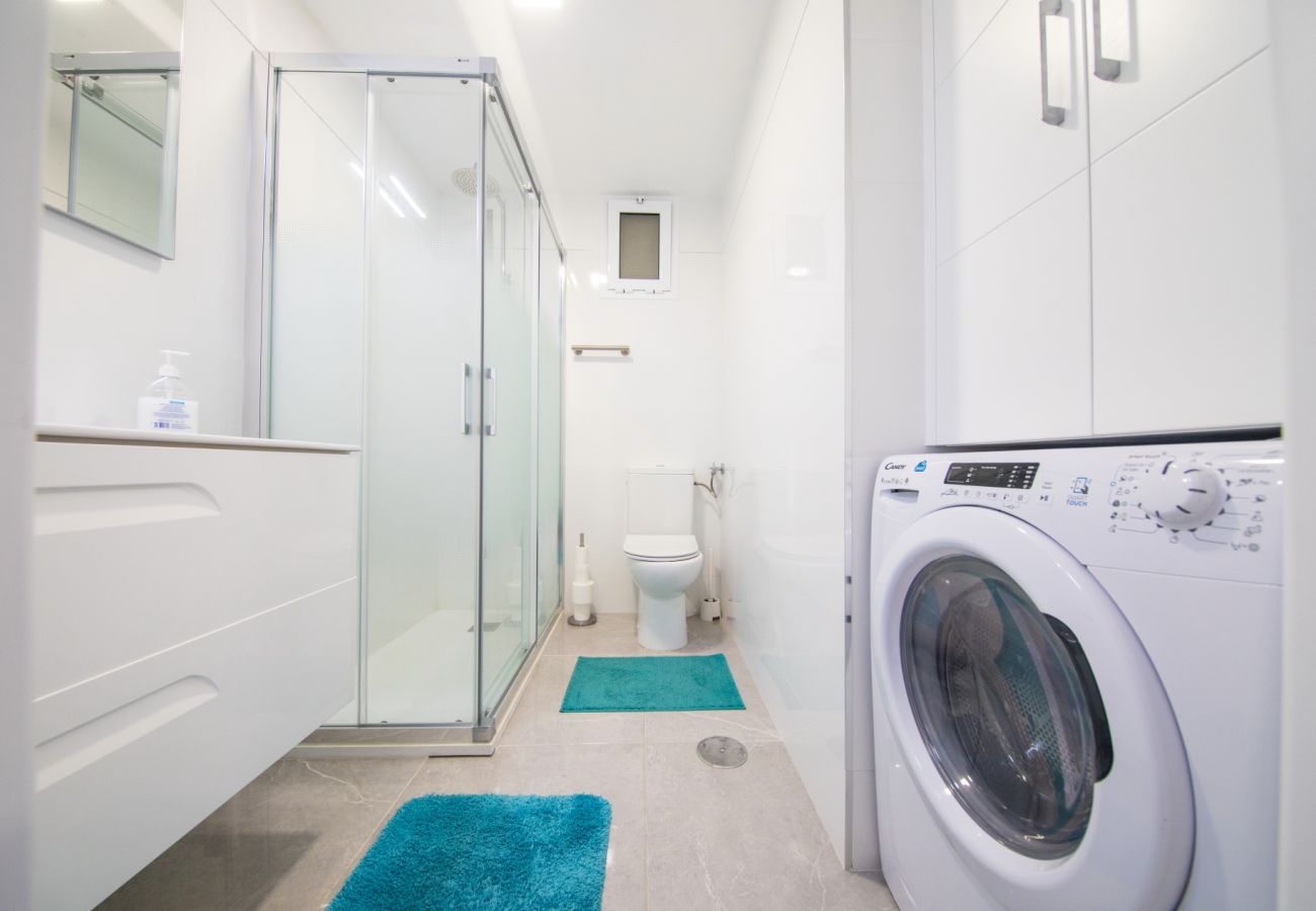 The bathroom is very comfortable, with plenty of light, a large mirror as well as a washbasin, shower, washing machine, hairdryer and storage space.